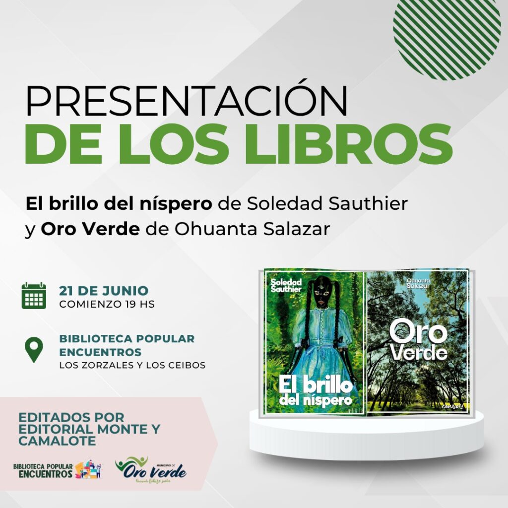 El 21 de junio a partir de las 19 hs en la biblioteca Popular Encuentros (Los Zorzales y Los Ceibos) se realizará la presentación de las autoras Soledad Sauthier y Ohuanta Salazar. El primer libro es, Oro Verde, de Ohuanta Salazar, bioingeniera y escritora de este poemario con “un sentido poético profundo es lanzado desde el arranque como una flecha que llega limpia y hasta la última página”. El segundo, El brillo del Níspero, son cuentos de la profesora de Lengua y Literatura (UADER) y escritora Soledad Sauthier. «Historias de personas de carne y hueso que, a veces, sin perder realidad atraviesan los límites de la fiebre y encuentran en lo fantástico su verdadera materia, su modo de habitar el mundo», se plasman en este libro. El municipio acompaña estas presentaciones con entrada libre y gratuita.