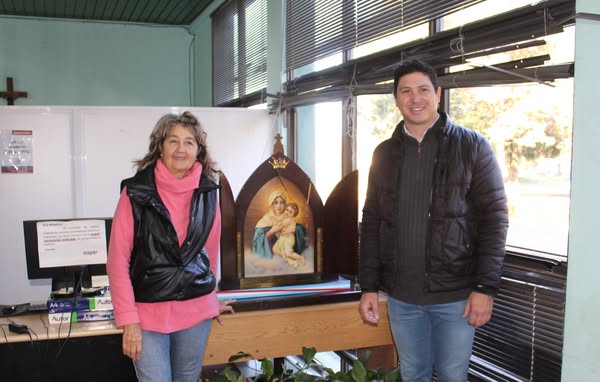 En la mañana de este lunes, la Municipalidad de Pronunciamiento tuvo la visita de la imagen peregrina de la Virgen de Schoenstatt, que permanecerá durante las próximas horas en la entrada del edificio municipal. El intendente Ricardo Sandoval la recibió por intermedio de Dora D’Angelo, quien desde la Capilla San José trasladará a la Virgen Peregrina a las distintas instituciones locales.