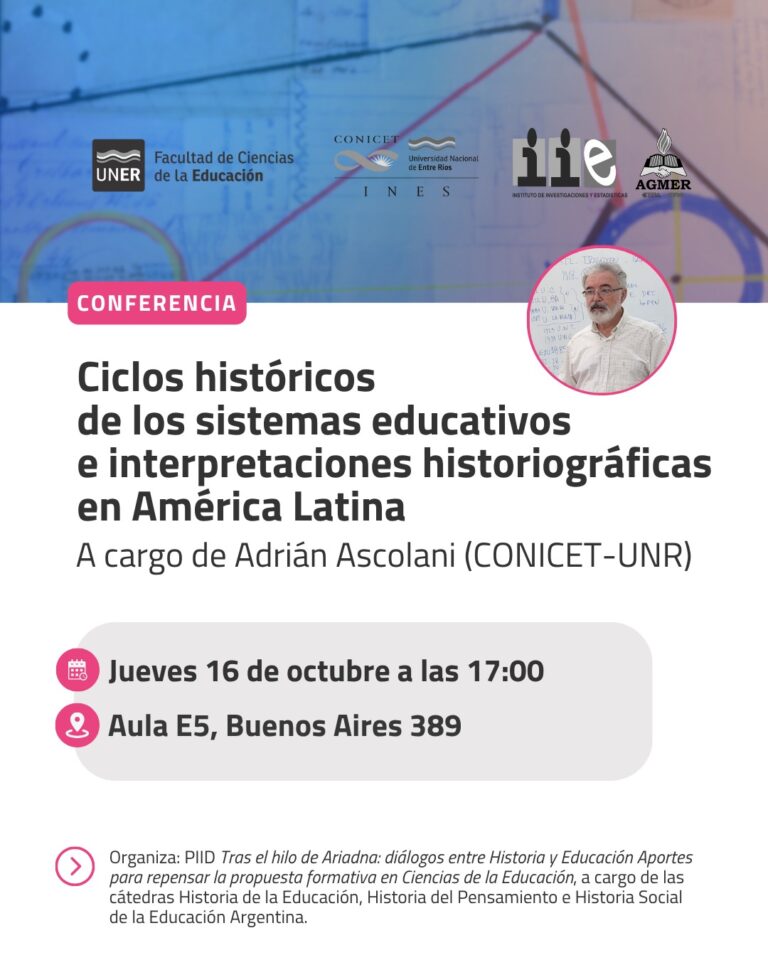 AGMER invita a las y los docentes a la conferencia sobre Ciclos históricos de los sistemas educativos, que dará el doctor Adrián Ascolani, este jueves 16 de octubre, a las 17.00, en la Facultad de Ciencias de la Educación (Buenos Aires 389). La actividad es con modalidad híbrida, por lo que se puede participar por videoconferencia. A través de su Instituto de Investigaciones y Estadísticas, AGMER coorganiza la actividad dirigida a estudiantes y graduados/as de Ciencias de la Educación, de Institutos de Formación Docente y a toda persona interesada en pensar los sistemas educativos desde una mirada histórica y latinoamericana. Para participar es necesario inscribirse vía formulario: http://bit.ly/3J0MUSB Adrián Ascolani es doctor en Historia por la Universidad Nacional de La Plata. Investigador Principal del Consejo Nacional de Investigaciones Científicas y Técnicas (CONICET), Director del Doctorado en Humanidades y Artes y Profesor titular de Historia Socio Política del Sistema Educativo Argentino, en la Facultad de Humanidades y Artes de la Universidad Nacional de Rosario.