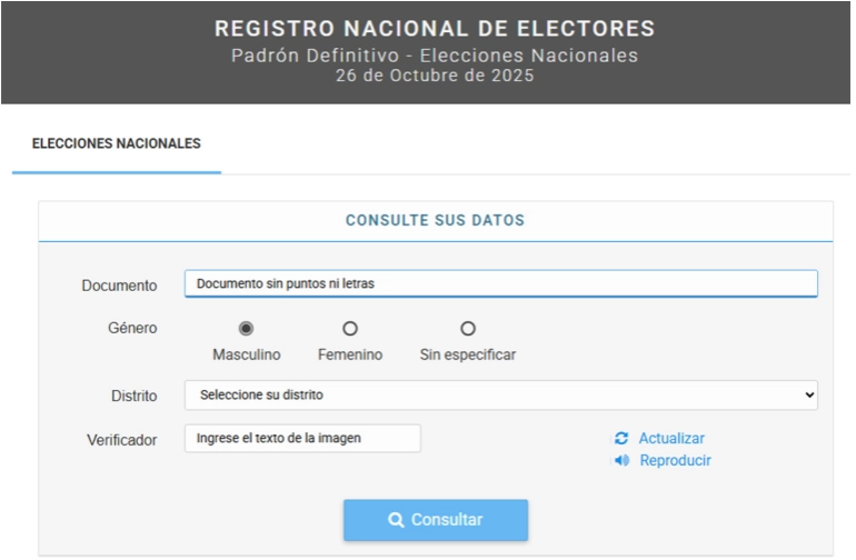 Está a disposición el padrón de electores con toda la información sobre el lugar de votación para las legislativas nacionales que se realizarán el próximo domingo.