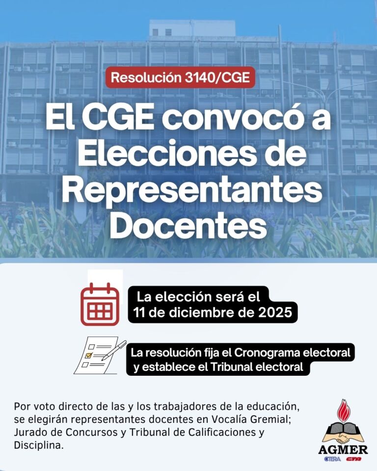 Las elecciones serán el 11 de diciembre de 2025. El Consejo General de Educación dio a conocer la Resolución 3140/25, con fecha 21 de octubre, a través de la cual se convoca a elecciones de representantes docentes en el Consejo General de Educación, Jurado de Concursos y Tribunal de Calificaciones y Disciplina, para el 11 de diciembre de 2025. La Resolución fija además el cronograma electoral y establece el Tribunal Electoral. Por voto directo de las y los trabajadores de la Educación se elegirán representantes docentes en Vocalía Gremial del CGE, Jurado de Concursos y Tribunal de Disciplina. Compartimos la Resolución 3140/25 CGE » https://agmer.org.ar/wp-content/uploads/2025/10/resolucion_3140-25_cge.pdf