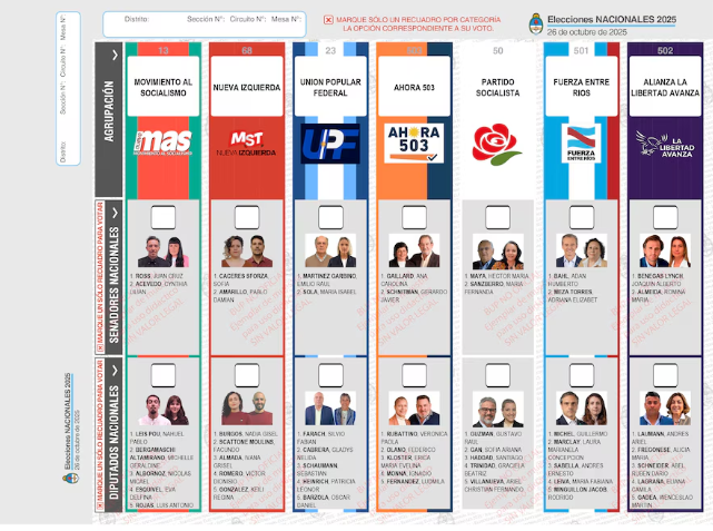 En el diseño elegido, los partidos políticos figuran en columnas verticales, mientras que los cargos a elegir se organizan en filas horizontales. Al lado de cada categoría, el votante encontrará una casilla en blanco para marcar la opción de su preferencia con una tilde o cruz, de manera clara y visible. Boleta Única de Papel Dos modelos de boleta según la provincia Cada elector votará para elegir diputados nacionales en todo el territorio argentino. Además, en ocho distritos —Capital Federal, Chaco, Entre Ríos, Neuquén, Río Negro, Salta, Santiago del Estero y Tierra del Fuego— también se elegirán senadores nacionales. Por esta razón, habrá dos modelos distintos de Boleta Única de Papel: uno que incluirá ambas categorías (diputados y senadores), y otro que solo contemplará la elección de diputados nacionales, según corresponda a cada jurisdicción. El cambio apunta a simplificar el proceso electoral, fortalecer la transparencia y asegurar que todas las fuerzas políticas tengan igual visibilidad ante el votante, eliminando la necesidad de reponer boletas durante la jornada. Paso a paso para votar con la Boleta Única de Papel El procedimiento de votación con la BUP consta de pasos simples y claros: El elector recibe la boleta firmada por la autoridad de mesa junto con una lapicera para marcar el voto. En la cabina, debe marcar una sola opción por categoría en el casillero correspondiente. Luego, debe doblar la boleta por la línea punteada para preservar el secreto del voto y depositarla en la urna. Finalmente, firma el padrón, entrega su documento y recibe la constancia de voto junto con su DNI.
