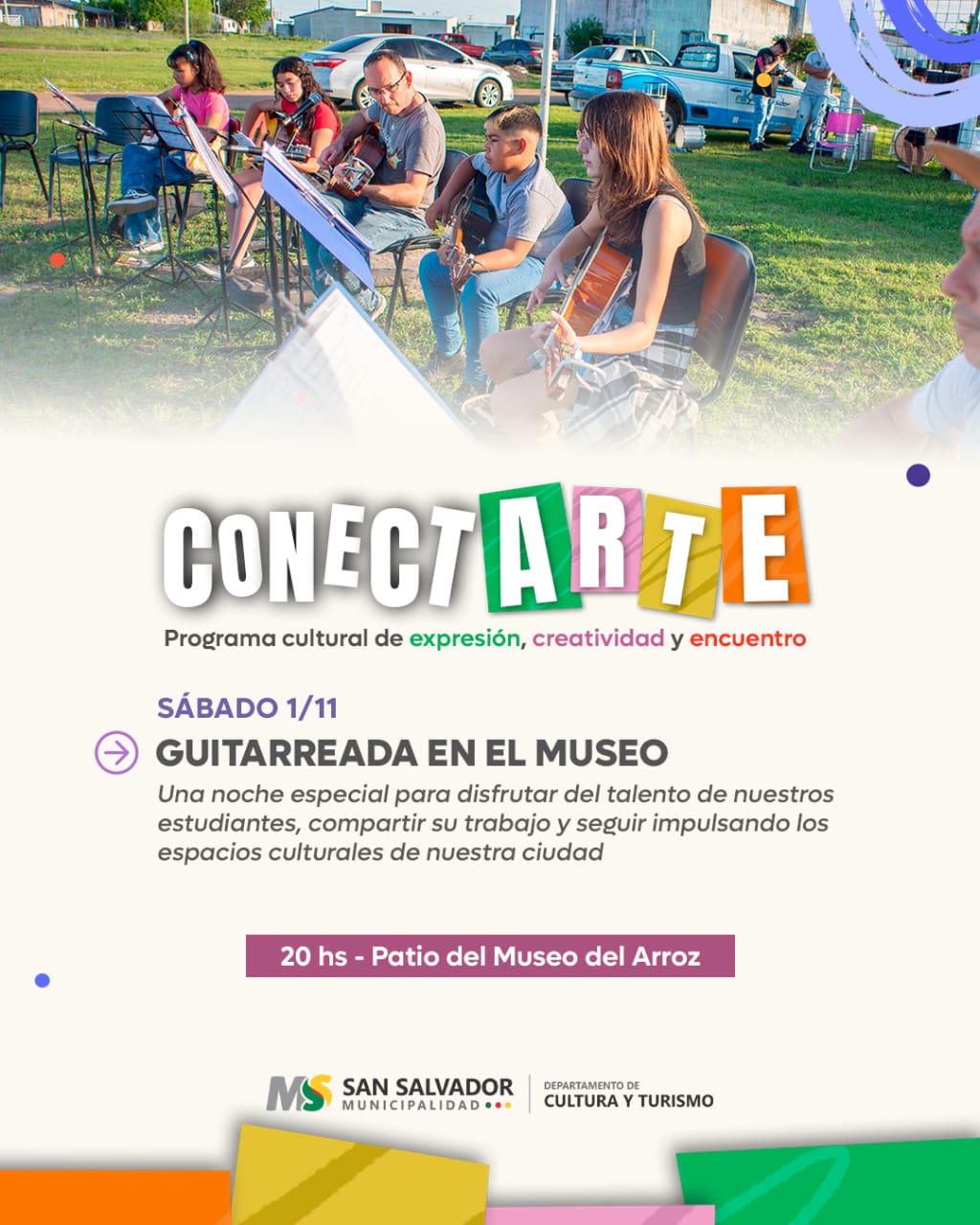 El programa cultural municipal ConectArte invita a la comunidad a disfrutar de una emotiva guitarreada este sábado 1 de noviembre, a las 20:00 horas, en el pintoresco patio del Museo del Arroz. En esta ocasión, el Taller Municipal de Guitarra realizará su presentación anual, ofreciendo un espacio abierto para que los alumnos compartan con el público el trabajo y los avances logrados durante el año. Será una noche de encuentro y disfrute a través de la música, donde los talentos locales mostrarán su dedicación y pasión por este instrumento. La Municipalidad invita a todos los vecinos y visitantes a participar de esta actividad cultural, que no solo promueve el arte local, sino que también busca fortalecer los espacios de aprendizaje y expresión en la ciudad, celebrando la música como punto de unión.