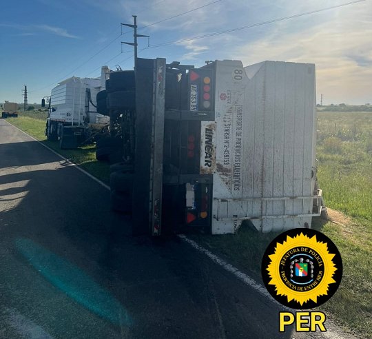Un camión marca Mercedes Benz, Modelo 1933 con un acoplado Marca LINCAR, que provenía de la Planta de Las Camelia en la ciudad de Villaguay, con la carga de alimentos para pollos, con destino la localidad de Colonia la Argentina. Por causas a establecer se salió accidentalmente al borde de la banquina con el acoplado el cual luego vuelca, desparramando su carga en parte de la ruta y el acoplado que en la cinta asfáltica sobre su lateral derecho. No hay personas lesionadas y el personal policial trabaja en el lugar señalizado y controlando el normal tránsito.