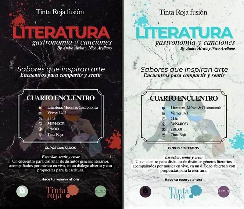 Tinta roja Fusión presenta Literatura, gastronomía y canciones Este viernes 14 de noviembre, a las 21 horas, en Tinta Roja Restobar Andrea Alvira y Nico Arellano compartirán un encuentro, el cuarto de un ciclo hermoso que enlaza propuestas artísticas con la gastronomía. Luego de la pintura, la cerámica y el teatro, llegan ellos con literatura y música. Los segmentos estarán conformados de fragmentos de textos literarios de géneros no tan explorados (cartas, instrucciones) y por supuesto, poemas, y un puñado de hermosas canciones. "La idea es que a partir de la lectura en voz alta y del diálogo en torno a los textos y las experiencias de quienes acompañen, podamos disfrutar de una linda noche de palabras, música y un exquisito menú. Y para quienes se animen, habrá algunos disparadores para la escritura", señalaron en la invitación. Villaguay 2025-11-11