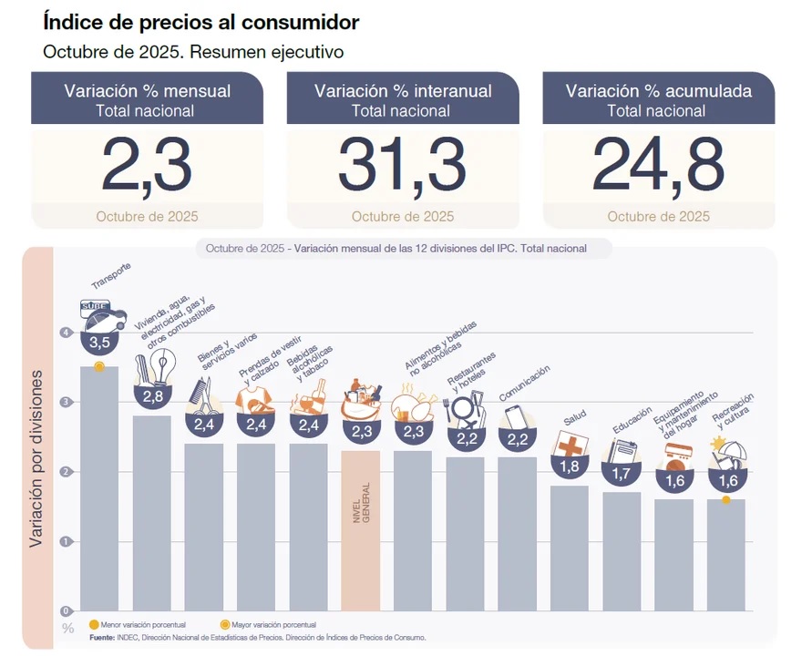 El Índice de Precios al Consumidor (IPC) registró en octubre una suba del 2,3%, informó este martes el Instituto Nacional de Estadística y Censos (INDEC). Con este resultado, la inflación acumuló un aumento del 24,8% en lo que va de 2025 y un alza interanual del 31,3%, mostrando una leve aceleración respecto de septiembre (2,1%). El dato, sin embargo, se mantiene dentro del rango de variación esperada por las consultoras privadas y refleja —según el Gobierno— la continuidad del proceso de desinflación iniciado a mediados de 2024. Caputo: “La variación interanual es la más baja desde julio de 2018” El ministro de Economía, Luis Caputo, destacó que el indicador “registra dieciocho meses consecutivos de desaceleración en la comparación interanual” y subrayó que “esta variación es la más baja desde julio de 2018”. Caputo señaló además que la inflación acumulada en los primeros diez meses del año fue “la menor para este período desde 2017, cuando alcanzó el 19,4%”. También precisó que la media móvil de seis meses se ubicó en 1,88%, el nivel más bajo desde enero de 2018. “El proceso de desinflación continuó a pesar de la caída en la demanda de dinero generada por la incertidumbre electoral y los intentos de la oposición de romper el ancla fiscal en los últimos meses”, sostuvo el ministro. Y agregó: “Esto refleja la solidez del programa económico y el éxito del orden fiscal y monetario en reducir el impacto de la volatilidad financiera sobre el poder adquisitivo de los argentinos”. Transporte y Vivienda, los rubros con mayores aumentos Según el informe del INDEC, la división de mayor aumento en octubre fue Transporte (3,5%), impulsada por subas en combustibles y servicios vinculados a la movilidad. En segundo lugar se ubicó Vivienda, agua, electricidad, gas y otros combustibles (2,8%). La división con mayor incidencia en el promedio nacional fue Alimentos y bebidas no alcohólicas, a excepción de la región Patagónica, donde se destacó el incremento en servicios de vivienda y energía. En contraste, Equipamiento y mantenimiento del hogar y Recreación y cultura fueron las categorías con menores alzas, ambas con 1,6%. Por tipo de precios, los Estacionales lideraron el aumento con 2,8%, seguidos por los Regulados (2,6%) y el IPC núcleo (2,2%). Comparación regional y tendencia mensual El relevamiento regional mostró que las mayores subas se dieron en la Patagonia y el Gran Buenos Aires, con 2,4%, seguidas por Cuyo y la Región Pampeana (2,1%), el Noreste (2,2%) y el Noroeste (2,1%). Con el dato de octubre, la inflación encadena cinco meses consecutivos de incrementos leves, pasando de 1,5% en mayo a 1,6% en junio, 1,9% en julio y agosto, 2,1% en septiembre y 2,3% en octubre. Expectativas moderadas para el cierre del año El Relevamiento de Expectativas del Mercado (REM) del Banco Central, que recopila proyecciones de 42 consultoras y entidades financieras, había estimado una inflación del 2,2% para octubre, cifra muy cercana al dato oficial. Para los próximos meses, los analistas prevén una ligera desaceleración, con un 1,9% para noviembre y 2% para diciembre, mientras que proyectan una inflación interanual de 29,6% al cierre de 2025. Pese a la leve aceleración mensual, los datos oficiales confirman que la inflación se mantiene en los niveles más bajos de los últimos años, en un contexto de estabilidad cambiaria y de políticas de orden fiscal y monetario que el Gobierno considera “fundamentales para sostener la desinflación”.