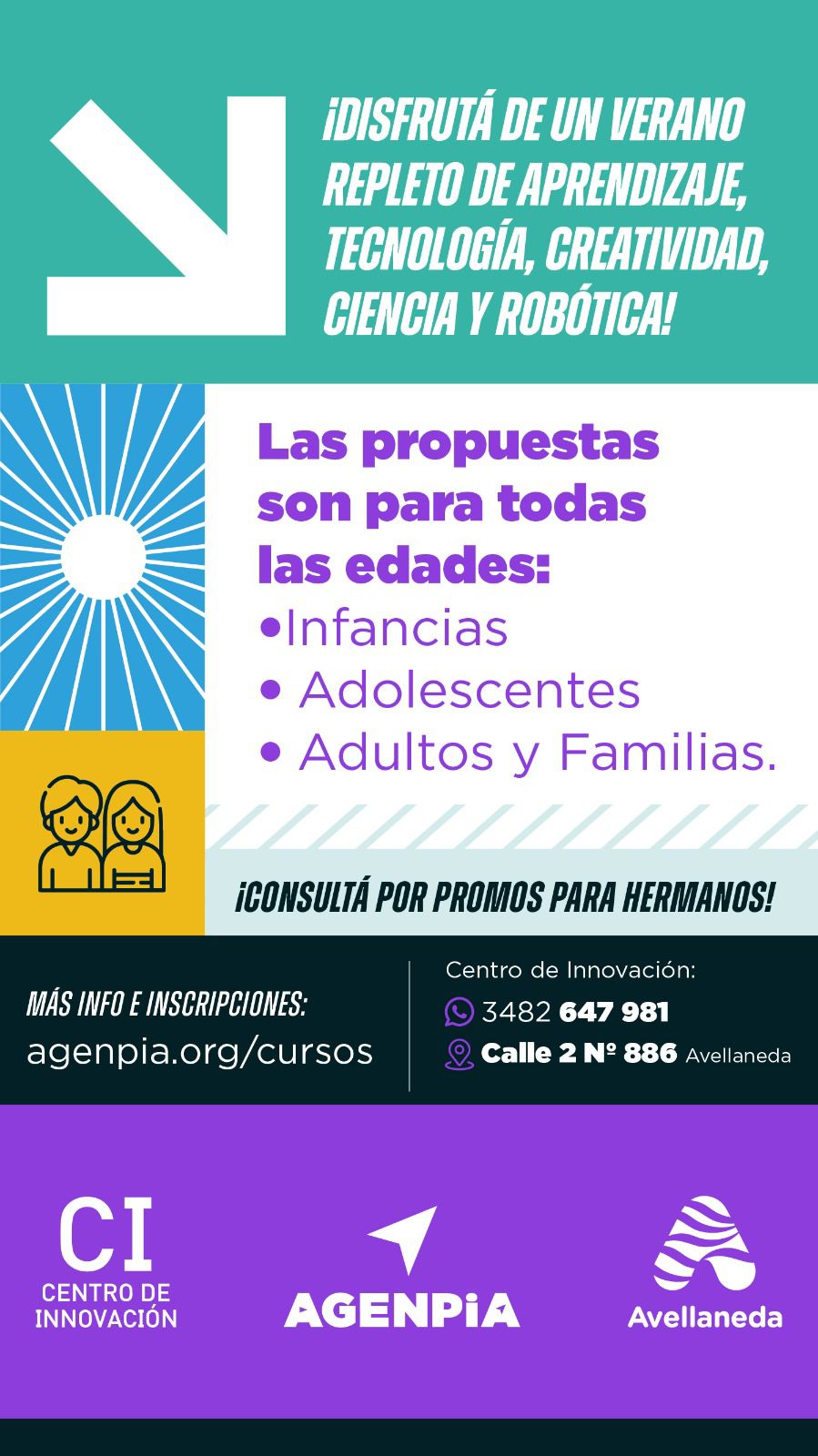 La Municipalidad de Avellaneda informa que se encuentran abiertas las inscripciones para los Cursos de Verano 2026, que se desarrollarán en el Centro de Innovación, ubicado en Calle 2 Nº 886. Las propuestas incluyen talleres pensados para infancias, preadolescentes, adolescentes, adultos y familias, con opciones que se adaptan a distintos intereses y niveles de experiencia. Toda la información detallada sobre cada curso (programas, docentes, destinatarios, requisitos y edades) puede consultarse acá. Hay becas disponibles para quienes necesiten apoyo económico, con el objetivo de garantizar el acceso a estas propuestas formativas. Además, se ofrece un beneficio especial: inscribiendo a hermanos, se aplica un 50% de descuento en el taller de menor valor. Para consultas o asistencia durante el proceso de inscripción, está disponible el contacto por WhatsApp al 3482 647981. Fuente: Gobierno de Avellaneda.