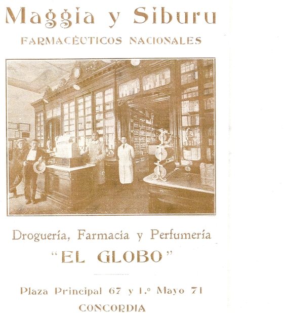 El señor Urtizberea fue una persona ampliamente conocida y comprometida con el quehacer ciudadano llegando a desempeñarse como concejal de Concordia entre 1900 y 1903, siendo uno de los propulsores de la construcción del busto del Gral. Urquiza que se encuentra hoy en la plaza, que antes se llamó Plaza Nueva, luego Ituzaingó y un poco más recientemente, Urquiza. El nombre de la farmacia se debe a que en el frente ostentaba un globo terráqueo que permaneció allí casi cincuenta años. Al año de instalado, Urtizberea se asocia con el Sr. Luís Maggia y ambos trabajaron juntos algunos años en forma exitosa en su amplio local de la calle 1º de Mayo 67-71 donde preparaban todas clases de recetas, como así también de productos de uso veterinario. Algún tiempo después el Sr. Urtizberea se vuelve al Salto de donde era oriundo y abre otra farmacia. Los diarios de ese tiempo promocionan para las “enfermedades secretas” como blenorragia, gonorrea, gota militar, todas las afecciones de la vejiga y riñones por crónicas que sean, cura radicalmente el “Antineón de Locher”, remedio vegetal inofensivo “Ovarín” se llama el remedio que cura las enfermedades de señoras y niñas, como la inflamación de los ovarios y de la matriz, flujos, menstruaciones dolorosas y desarregladas. El Sr. Luís Maggia decide formar sociedad con el Sr. Justo Siburu a quien agradaba más el trabajo de laboratorio, mientras que a Maggia le atraía más la atención al público y hacer las recomendaciones sobre el uso de los preparados. Esta farmacia siempre tuvo muy buena clientela si tenemos en cuenta además su ubicación estratégica frente a la plaza principal de la ciudad. Pero fue también famosa por las fórmulas y preparados. Algunos de su propia invención, pero también muy eficaces. Todos se rotulaban y etiquetaban. Si se deseaba repetir el medicamento, sólo había que llevar el frasco en cuya etiqueta estaban escritos los miligramos de cada componente. Se hacían también como ya hemos visto en otros casos, productos de uso veterinario para tratamiento de parásitos intestinales y también de uso externo como los garrapaticidas arsenicales y otros productos también de uso veterinario importados directamente de los Estados Unidos. Es decir que no sólo era farmacia sino también herboristería y droguería surtiendo también a toda la Mesopotamia. La importancia que tuvo esta farmacia la da el hecho de que trabajaban diez idóneos de farmacia en la preparación de recetas. Maggia & Siburu fue una sociedad que duró hasta 1937, año en el que “Quiso el destino que en un solo día el comercio perdiera a sus dos puntales: fallecen a escasas horas uno de otro, los señores Maggia y Siburu. Un doble cortejo fúnebre pasó silenciosamente frente a la farmacia ese día. La viuda de Don Justo Siburu, Doña Ercilla Libarona de Siburu decidió continuar con la farmacia, haciéndose cargo de la misma su hijo el Dr. Carlos Siburu posteriormente actuó el Dr. Roberto Ángel Jermou. Ya para 1940 la farmacia era propiedad del Señor Miguel Pedro Rebot” El nuevo dueño, si bien no era farmacéutico, tenía sin embargo una gran experiencia en las tareas prácticas de la profesión, lograda a través de muchos años en los que se desempeñó al frente de la única farmacia existente en la localidad de Gilbert. Como en esa localidad tampoco había médico, todos recurrían a el, lo que le permitió un gran conocimiento de las enfermedades más comunes de niños y adultos en cuanto a su diagnóstico y tratamiento En 1925 se le otorgó el título de Idóneo de Farmacia Matriculado en la ciudad de Paraná. La regencia de la farmacia la ejerció el Dr. Roberto Ángel Jermou durante muchos años hasta su fallecimiento. Don Miguel P. Rebot tenía una sólida fortuna obtenida primero en Gilbert, donde sus actividades no se limitaron sólo a la farmacia, sino que tuvo la usina del pueblo, criadero de pollos, vendía el aceite para toda la maquinaria agrícola de la zona, y también hacía los seguros a todos los productores agrícolas. Entre su numerosa clientela de Gilbert se contaba todo el personal del establecimiento “La Centella” de Juan F. Morrogh Bernard. Aquí en Concordia tenía forestaciones y también numerosas casas de alquiler y terrenos. Don Miguel Pedro Rebot falleció en 1983, haciéndose cargo uno de sus hijos llamado también Miguel Antonio, quién decidió trasladar la farmacia a la calle San Luís y Quintana. En su nueva dirección en 1985 cumplió los 100 años la farmacia “Del Globo”. Miguel Rebot había trasladado todo el mobiliario de la vieja farmacia a su nueva dirección, teniendo como regente a la Dra. Victoria Franzolini de Pacharoni. El lugar en el cual se instaló era un viejo salón al que modernizó por completo, el que tenía una curiosa particularidad, para acceder al local se lo hacía descendiendo dos escalones Trabajó allí durante varios años hasta que, por razones de salud y edad, la puso en venta. El 1º marzo de 2000 Farmacia del Globo fue adquirida por el Sr. Héctor Maíz y es su actual propietario. Un dato que merece ser destacado en la familia Rebot es el de haber tenido tres generaciones de propietarios de farmacia; Miguel P., Miguel A y Hugo C. Rebot, este último propietario de la Farmacia Salta. Para mayor relevancia de esta curiosa vocación, el primo de Hugo y sobrino de Miguel A. llamado Daniel Rebot era farmacéutico y propietario de la Farmacia Unión, (recientemente fallecido) Ads
