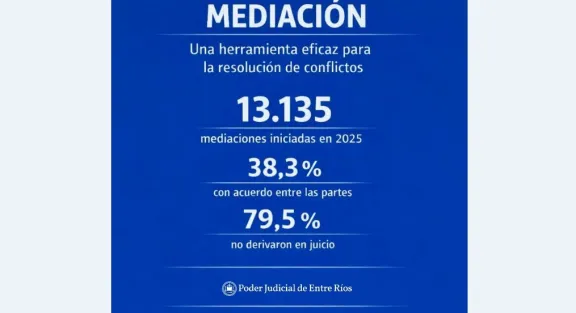 Este año se iniciaron 13.315 mediaciones para la resolución de conflictos En cuanto a los resultados de los procedimientos mediatorios, las estadísticas reflejan que: - El 38,3% de las mediaciones concluyeron con acuerdo entre las partes. - El 33,2% finalizaron sin acuerdo. - El 21,4% concluyeron por incomparecencia injustificada de alguna de las partes. - El 4,3% finalizaron por desistimiento. Estos indicadores evidencian que una proporción significativa de los conflictos sometidos a mediación encuentra una solución consensuada, mientras que, aún en los casos en que no se arriba a un acuerdo, el proceso mediatorio cumple un rol relevante en la gestión del conflicto. Bajo nivel de judicialización posterior Un dato particularmente relevante es que solo el 20,5% de las mediaciones iniciadas durante 2025 derivaron posteriormente en la iniciación de un proceso judicial, lo que confirma el impacto positivo de la mediación como mecanismo preventivo de la litigiosidad. Del total de procedimientos: - El 15,7% derivaron en juicios iniciados en el fuero de Familia. - El 4,8% derivaron en juicios iniciados en el fuero Civil y Comercial. El 79,5% de los casos no generaron la apertura de un expediente judicial, permitiendo a las partes resolver o encauzar el conflicto sin necesidad de recurrir a los tribunales. Alcance territorial y recursos humanos Durante el año 2025, el CMARC coordinó la actividad mediatoria en las 18 jurisdicciones judiciales de la provincia, contando con un registro de 681 mediadores y mediadoras matriculados y habilitados, distribuidos estratégicamente en todo el territorio entrerriano. Un aporte concreto al acceso a la justicia La mediación, como mecanismo alternativo de resolución de conflictos, ofrece múltiples beneficios para la ciudadanía: constituye una vía más rápida, económica y participativa, reduciendo los costos emocionales y materiales asociados a los procesos judiciales prolongados. Para el Poder Judicial, representa además una herramienta clave para optimizar el servicio de justicia, permitiendo que los órganos jurisdiccionales concentren su intervención en aquellos casos que requieren una decisión judicial directa. El trabajo desarrollado durante 2025 reafirma el compromiso del Superior Tribunal de Justicia de Entre Ríos con el fortalecimiento de políticas públicas orientadas al acceso efectivo a la justicia, la pacificación social y la resolución colaborativa de los conflictos. (APFDigital)