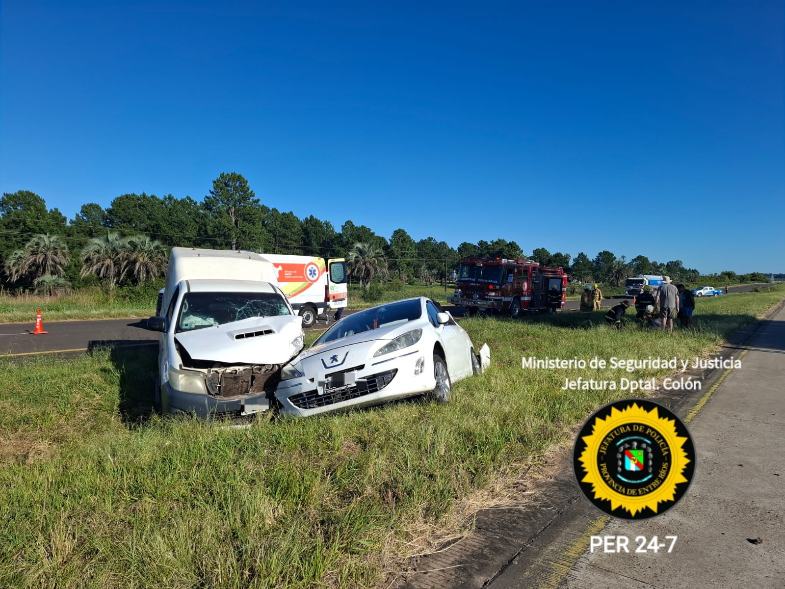 Según se confirmó a Génesis24, en la mañana de hoy, siendo alrededor de las 08:00 horas, personal policial de la Comisaría Ubajay tomó intervención en un siniestro vial ocurrido sobre la Autovía Gervasio Artigas, al kilómetro 196. Por causas que se tratan de establecer, una camioneta Toyota Hilux, conducida por un hombre mayor de edad, que se desplazaba en sentido norte a sur, impactó por alcance contra un automóvil Peugeot 408, al mando de un conductor de 37 años, quien viajaba junto a su grupo familiar, integrado por una mujer de 35 años y un bebé de 6 meses. A raíz del impacto, la mujer y el pequeño fueron asistidos en el lugar y posteriormente trasladados en ambulancia al Hospital San Benjamín, de la ciudad de Colón, donde tras ser evaluados por los profesionales médicos se determinó que presentaban lesiones de carácter leve. Cabe señalar que no se registraron interrupciones en el tránsito, el cual se mantuvo con normalidad en ambas manos de la Autovía.