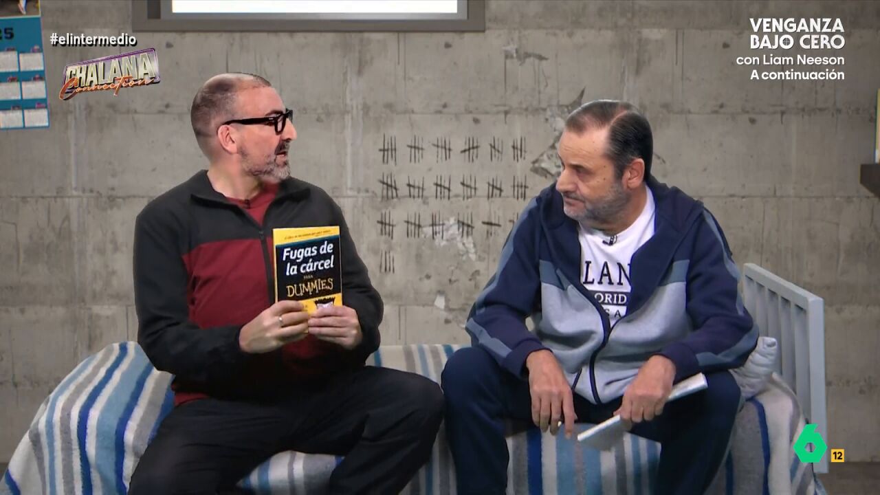 El Intermedio estrena un nuevo capítulo de su serie 'Chalana connection', protagonizada por 'José Luis Ábalos' y 'Koldo García'. El 'exsocialista' está haciendo un crucigrama cuando su 'exasesor' le muestra un libro que le ha dado un miembro del clan de los albaneses a cambio de un paquete de tabaco. El libro se titula 'Fugas de la cárcel para dummies'. "Tiene todos los trucos: descolgarse con sábanas por la ventana, cortar rejas con una lima, hacer un túnel con una cucharilla...", cuenta 'Koldo'. "¿Qué le parece?", pregunta a su compañero de celda. "Me parece que eres gilipollas, coño", responde, "sí, es un libro para dummies, pero muy dummies". "Eres un bigardo de 140 kilos, necesitas una cadena perpétua para hacer un túnel con una cucharilla", añade. "Ya lo sé, jefe", se lamenta 'García', "por eso mi idea es encargarle el túnel a Servinabar, y ya de paso sacarnos una comisión". "Para no tragar polvo, tengo otro contacto que nos pasa mascarillas", añade 'Koldo', "es un win-win". "Pero ¿cómo van a entrar aquí los de Servinabar, que no estamos en La Chalana, coño, que aquí lo más parecido a un centollo son las cucarachas del váter". 'Koldo' considera que, debido a la lentitud del juez, "me apuesto un brazo a que los de Servinabar estarán aquí encerrados en dos semanas". "Y son expertos en cavar túneles", añade. "Son expertos en trincar cavando túneles", responde 'Ábalos'. El 'exsocialista', además, duda de que pudieran ocultarlo. "Lo tengo todo planeado", afirma 'Koldo', "el guardia de la noche hace su última ronda a las 11 y el siguiente no pasa hasta las cinco de la madrugada, tenemos seis horas enteritas". "Lo mejor es que usted solo tiene que dormir", añade 'García', "teniendo en cuenta que ronca como un martillo neumático no se notará el ruido".