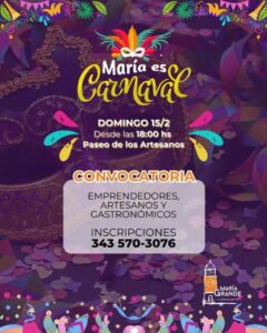 Artesanos, emprendedores y gastronómicos: ya pueden sumarse con su stand a una nueva edición de María es Carnaval, invitó la Municipalidad de María Grande. Será el 15 de febrero desde las 18 en el Paseo de los Artesanos. Inscripciones desde el 2 de febrero: 3435703076 Los esperamos para compartir una jornada de feria, encuentro y producción local.