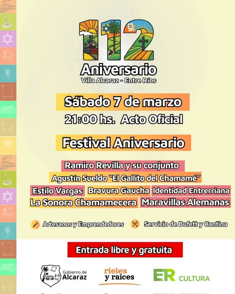 El próximo 7 de marzo celebramos un nuevo aniversario de nuestro centenario pueblo, reafirmando la identidad que nos une y la historia que nos proyecta hacia el futuro, se invitó oficialmente. A las 21:00 hs., tendrá lugar el Acto Oficial en el predio del ex ferrocarril, con la presencia de autoridades, vecinas y vecinos de la comunidad. Luego damos lugar al Gran Festival Aniversario con la participación de numerosos artistas invitados, feria de artesanos y emprendedores, servicio de buffet y cantina. .