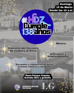 Leido 4 veces El domingo 15 de marzo, desde las 10, se realizará la celebración por el aniversario de la ciudad, en la Plaza Parque Urquiza. En la oportunidad, habrá actividades para disfrutar en familia, como concurso del Cocinero Osobuco al disco, música en vivo, feria de artesanos y emprendedores, encuentro y exposición de autos y motos clásicos y antiguos, con entrada libre y gratuita. (Fuente: Municipio de Hernández)