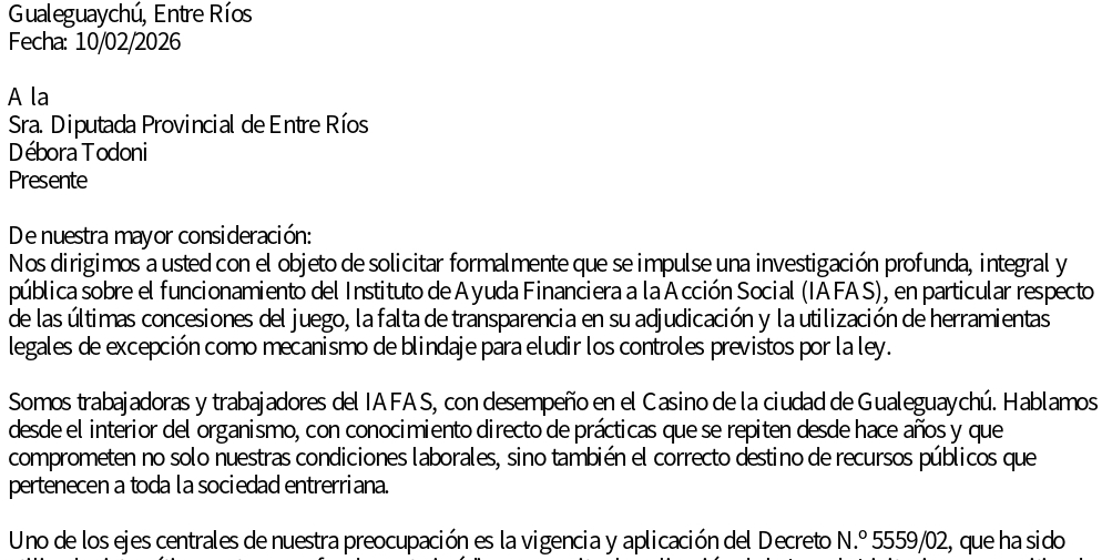 Trabajadores del Casino de Gualeguaychú presentaron una nota formal ante la diputada provincial Débora Todoni (La Libertad Avanza), exigiendo una investigación exhaustiva sobre las contrataciones directas y el presunto conflicto de intereses de ex funcionarios. Tras las revelaciones periodísticas hechas por este portal sobre la corrupción estructural que operaría desde hace dos décadas, el personal del organismo rompió el silencio para denunciar cómo el Decreto 5559/02 se utiliza como una herramienta de excepción permanente para eludir los controles de la Ley de Licitaciones y beneficiar a sectores privados en perjuicio de la acción social. Lo que comenzó como una serie de publicaciones periodísticas sobre la «caja negra» del juego en Entre Ríos ha desencadenado una reacción sin precedentes dentro del propio Instituto de Ayuda Financiera a la Acción Social (IAFAS). Empleados de carrera, con años de desempeño en el Casino de Gualeguaychú, han decidido elevar una denuncia formal a la Legislatura provincial. La misiva, dirigida a la diputada Débora Todoni, no solo valida las irregularidades publicadas recientemente, sino que aporta la visión de quienes conocen el organismo desde sus entrañas. Los trabajadores denuncian la existencia de una «estructura de funcionamiento opaca» que compromete los recursos públicos destinados a la asistencia social de los entrerrianos. El eje central de la denuncia radica en el uso sistemático del Decreto N.º 5559/02. Según los firmantes, esta norma funciona como un «blindaje administrativo» que permite al IAFAS eludir la Ley Provincial N.º 5140 (Régimen de Contrataciones del Estado). Evidentes irregularidades: el decreto permite contrataciones directas sin publicidad suficiente ni competencia real. Desnaturalización legal: la Ley 5140 establece la licitación pública como principio general, pero en el IAFAS la excepción se ha convertido en la regla. Perjuicio social: al evitar el control y la transparencia, se consolida un esquema cerrado que beneficia a empresas privadas del juego en articulación con sectores del poder político. Los trabajadores solicitan expresamente la derogación de este decreto para restituir la plena vigencia de los mecanismos de control ordinarios. Uno de los puntos más graves señalados en el documento es la situación del Sr. Germán Irasusta, ex alto funcionario del IAFAS. La nota detalla cómo Irasusta, tras ocupar cargos jerárquicos con poder de decisión sobre contratos y concesiones, pasó rápidamente a ocupar un cargo directivo en el sector privado del juego. Esta práctica, conocida como «puerta giratoria», es denunciada por los empleados como un conflicto de intereses que pone en duda la imparcialidad de todas las decisiones adoptadas durante su gestión y debilita cualquier capacidad de control real sobre las empresas concesionarias actuales. La denuncia de los empleados de Gualeguaychú se suma a las recientes revelaciones que indican que el IAFAS operaría bajo un esquema de corrupción estructural desde hace más de veinte años. La falta de transparencia en la adjudicación de las últimas concesiones es vista como la continuación de una política de «caja negra» donde los fondos que deberían alimentar la acción social terminan desviados hacia intereses particulares. «Hablamos desde el interior del organismo, con conocimiento directo de prácticas que se repiten desde hace años sin transparencia no hay control, y sin control no hay democracia real». Con la presentación de esta nota por parte de los propios trabajadores de carrera, quienes arriesgan su estabilidad laboral para denunciar lo que sucede puertas adentro, la presión sobre los órganos de control es máxima. La ciudadanía y los denunciantes se preguntan ahora: ¿Qué elementos adicionales necesita el Fiscal de Estado para actuar? La documentación aportada y el testimonio de los agentes públicos que manejan el día a día del casino parecen ser pruebas más que suficientes para que la justicia rompa el silencio y el blindaje que protege al IAFAS. Puntos clave de la solicitud a la Legislatura: - Investigación integral del funcionamiento del IAFAS. - Esclarecimiento de las últimas concesiones de juego. - Revisión del rol de exfuncionarios hoy vinculados a empresas privadas. - Derogación inmediata del Decreto 5559/02.