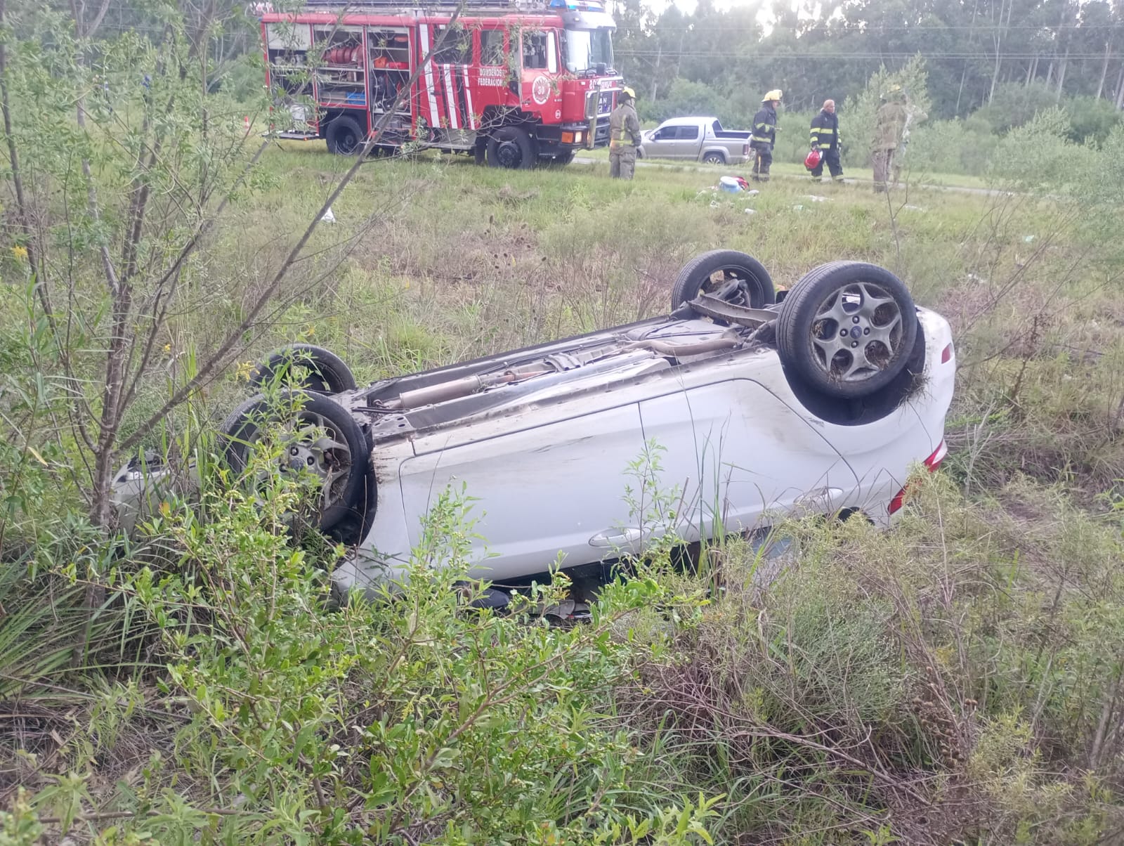 Por causas que se investigan, un automóvil que circulaba en sentido NorteSur despistó y terminó volcando sobre la banquina, quedando con sus cuatro ruedas hacia arriba. Cinco ocupantes, entre ellos tres menores Según se informó a 7Paginas, en el vehículo viajaban dos personas mayores de edad y tres menores. Tras el accidente, todos fueron asistidos en el lugar por los servicios de emergencia y posteriormente trasladados en ambulancia al Hospital San Jose de Federacion para su evaluación médica. De acuerdo a los primeros informes, los ocupantes presentaban lesiones de carácter leve, aunque permanecieron bajo observación para descartar complicaciones. Investigan las causas No se descarta que el mal estado de la cinta asfáltica haya sido un factor determinante en el despiste y posterior vuelco, aunque las circunstancias del hecho continúan bajo análisis. En el lugar trabajó personal policial junto a Bomberos, quienes realizaron las tareas de asistencia y adoptaron las medidas de seguridad correspondientes para garantizar la normal circulación en el sector.