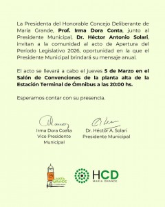 Leido 4 veces La Presidenta del Honorable Concejo Deliberante de María Grande, Prof. Irma Dora Conta, junto al Presidente Municipal, Dr. Héctor Antonio Solari, invitan a la comunidad al acto de Apertura del Período Legislativo 2026, oportunidad en la que el Presidente Municipal brindará su mensaje anual. El evento será el Jueves 5 de marzo a la hora 20:00 en el Salón de Convenciones-Planta Alta de la Estación Terminal de Ómnibus. Un espacio institucional de encuentro y diálogo para dar inicio a un nuevo período legislativo. Fuente: Municipalidad de María Grande