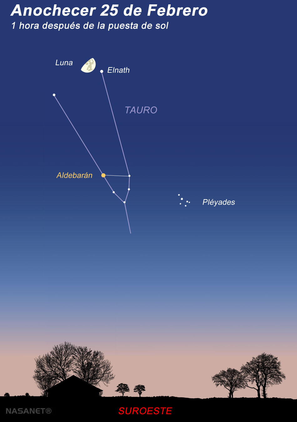 Esta noche la Luna se situará al lado de la estrella Elnath, también conocida como Beta Tauri, las estrella superior en las puntas de los cuerno de Tauro, el Toro: Busca a Elnath en la parte inferior derecha de la Luna. Es la segunda estrella más brillante de la constelación de Tauro (después de Aldebarán) y representa una de las puntas de los cuernos del toro. La estrella situada al otro extremo es Zeta Tauri más débil, que junto con Beta Tauri forman los cuernos del toro. Debajo de Luna está la brillante estrella anaranjada Aldebarán. Y a la derecha de Aldebarán podrás ver a las Pléyades.