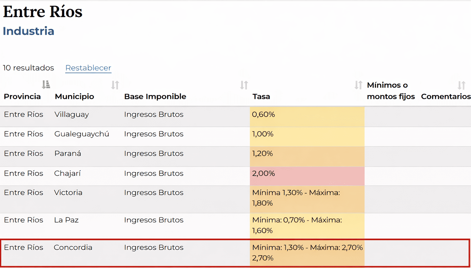 Tasas municipales en Entre Ríos: Concordia entre los municipios con alícuotas más elevadas según el portal de denuncias del Gobierno Nacional El Gobierno Nacional, a través de la Jefatura de Gabinete de Ministros, lanzó un portal público donde cualquier ciudadano puede consultar y denunciar las tasas que cobra cada municipio del país. Los datos disponibles sobre Entre Ríos revelan que Concordia registra, en varias categorías, las alícuotas máximas más altas de la provincia entre los distritos relevados. Concordia | Periodismo de investigación El sitio que pone bajo la lupa las tasas municipales La plataforma de denuncias de tasas municipales en Entre Ríos y de todo el país ya está en línea. Se trata de una iniciativa del Poder Ejecutivo Nacional que, en el marco de su disputa con los municipios por la carga impositiva local, habilitó un canal público y gratuito para que los contribuyentes puedan conocer y reportar los tributos que les aplican las comunas. El sitio, disponible en https://www.argentina.gob.ar/jefatura/tasas-municipales, opera bajo la órbita de la Jefatura de Gabinete de Ministros de la Nación y fue anunciado el 24 de febrero de 2026 por el jefe de Gabinete, Manuel Adorni, a través de sus redes sociales. El acceso es directo: no requiere registración previa ni cuenta en plataformas del Estado. Cualquier persona puede ingresar, consultar y, si detecta una tasa que no figure en el listado, reportarla mediante el botón Reportá una tasa. La iniciativa se inscribe en la política del Ejecutivo nacional de presionar a los intendentes para que reduzcan la presión fiscal sobre comercios y servicios, en simultáneo con la prohibición de incluir tasas municipales en las facturas de servicios públicos. Estructura y funcionamiento del portal El sitio presenta un mapa interactivo de la Argentina. Al seleccionar una provincia, se despliegan los municipios relevados y sus tasas, organizadas en cinco categorías: tasa vial, entidades financieras, actividades primarias, industria e hipermercado. Para cada registro se consignan el municipio, la base imponible sobre la que se aplica el tributo, la alícuota (o rango de alícuotas), y los mínimos o montos fijos cuando corresponden. Los casos en los que no se contaba con información al momento del relevamiento quedan explicitados con esa leyenda. Según consta en el propio portal, la información se elaboró sobre la base de las Ordenanzas Fiscal y Tarifaria aprobadas al inicio del ejercicio, sin contemplar eventuales modificaciones dictadas con posterioridad. Los datos fueron relevados de los sitios web oficiales de los municipios al 31 de marzo de 2025. Esto significa que los valores consignados corresponden a la normativa vigente a comienzos de 2025 y no necesariamente reflejan actualizaciones posteriores. Entre Ríos bajo la lupa: los datos por categoría Para la provincia de Entre Ríos, el portal registra información total o parcial de diez municipios en cada categoría. En las categorías de actividades primarias, industria e hipermercado, tres municipios (Colón, Concepción del Uruguay y Gualeguay) no tenían datos disponibles al momento del relevamiento. A continuación, el detalle de cada categoría: Tabla 1: Entidades Financieras | Municipio | Base Imponible | Tasa | Mínimos / Montos Fijos | | Villaguay | Diferencia entre total del haber de cuentas de resultado e intereses/actualizaciones pasivas | 8,00% | $ 9.000.000 | | Chajarí | Total del haber de cuentas de resultado | 7,00% | $ 11.592.000 | | Concordia | Diferencia entre total del haber de cuentas de resultado e intereses/actualizaciones pasivas | 6,50% | $ 250.000 | | La Paz | Diferencia entre total del haber de cuentas de resultado e intereses/actualizaciones pasivas | 5,00% | $ 467.520 | | Victoria | Total del haber de cuentas de resultado | 5,00% | $ 1.157.464 | | Paraná | Total del haber de cuentas de resultado | 4,50% | $ 2.046.030 | | Gualeguaychú | Diferencia entre total del haber de cuentas de resultado e intereses/actualizaciones pasivas | 3,00% | $ 292.152 | | Colón | No disponible al momento del relevamiento | | | | Concepción del Uruguay | No disponible al momento del relevamiento | | | | Gualeguay | No disponible al momento del relevamiento | | | Fuente: elaboración propia en base a información disponible en argentina.gob.ar/jefatura/tasas-municipales. Datos relevados al 31/03/2025. Tabla 2: Actividades Primarias | Municipio | Base Imponible | Tasa | Mínimos / Montos Fijos | | Paraná | Ingresos Brutos | 1,20% | | | Gualeguaychú | Ingresos Brutos | 1,50% | | | Victoria | Ingresos Brutos | Mín. 1,30% Máx. 1,80% | | | La Paz | Ingresos Brutos | Mín. 0,70% Máx. 1,60% | | | Villaguay | Ingresos Brutos | 1,65% | | | Chajarí | Ingresos Brutos | 2,00% | | | Concordia | Ingresos Brutos | Mín. 1,30% Máx. 2,70% | | | Colón | No disponible al momento del relevamiento | | | | Concepción del Uruguay | No disponible al momento del relevamiento | | | | Gualeguay | No disponible al momento del relevamiento | | | Fuente: elaboración propia en base a información disponible en argentina.gob.ar/jefatura/tasas-municipales. Datos relevados al 31/03/2025. Tabla 3: Industria | Municipio | Base Imponible | Tasa | Mínimos / Montos Fijos | | Villaguay | Ingresos Brutos | 0,60% | | | Gualeguaychú | Ingresos Brutos | 1,00% | | | Paraná | Ingresos Brutos | 1,20% | | | Victoria | Ingresos Brutos | Mín. 1,30% Máx. 1,80% | | | La Paz | Ingresos Brutos | Mín. 0,70% Máx. 1,60% | | | Concordia | Ingresos Brutos | Mín. 1,30% Máx. 2,70% | | | Chajarí | Ingresos Brutos | 2,00% | | | Colón | No disponible al momento del relevamiento | | | | Concepción del Uruguay | No disponible al momento del relevamiento | | | | Gualeguay | No disponible al momento del relevamiento | | | Fuente: elaboración propia en base a información disponible en argentina.gob.ar/jefatura/tasas-municipales. Datos relevados al 31/03/2025. Tabla 4: Hipermercado | Muni