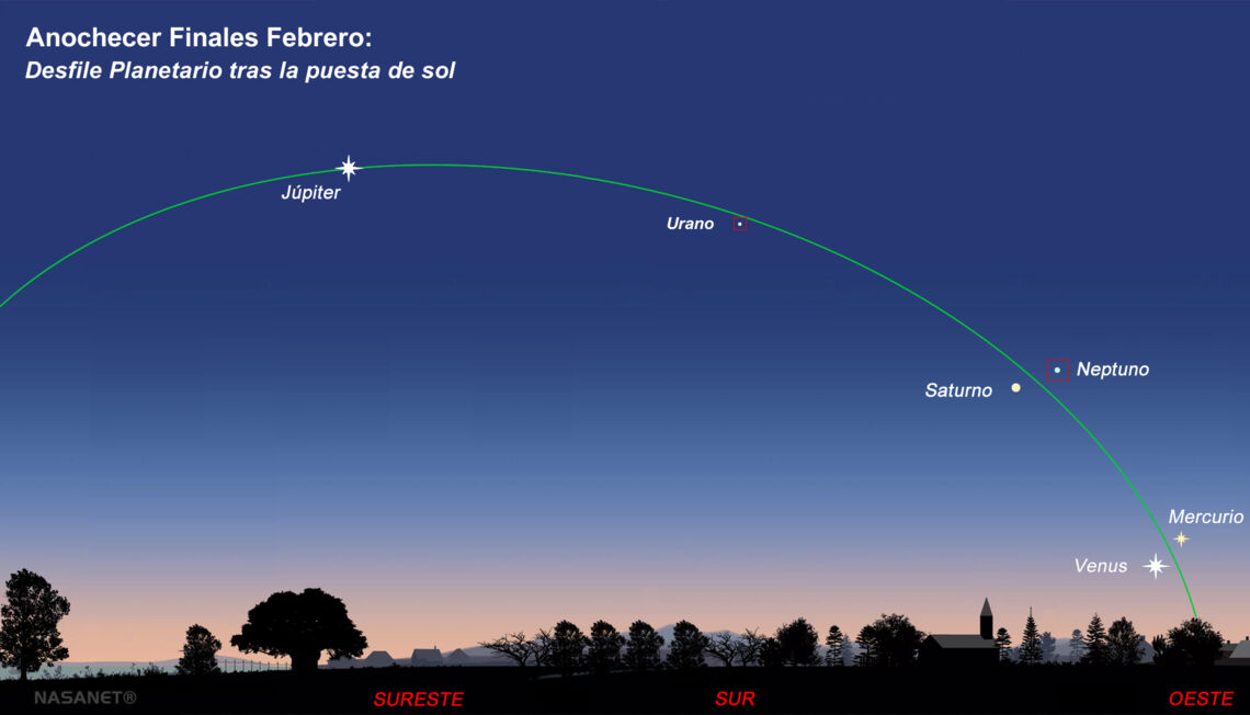 Según los astrónomos, esta última semana de Febrero será el mejor momento para poder ver un gran desfile de planetas. Poco después de la puesta de sol y una vez comience a anochecer, los planetas Venus, Mercurio, Saturno, Neptuno, Urano y Júpiter parecerán alinearse a lo largo de una línea imaginaria, llamada eclíptica, que representa el plano del sistema solar en el que orbitan los planetas alrededor del Sol. Los astrónomos se apresuran a señalar que la alineación es una ilusión, dada la trayectoria elíptica muy variable de la órbita de cada planeta alrededor del Sol. Sin embargo, al observarlos desde la Tierra parecen crear una fila a lo largo de la eclíptica. Estos días, Júpiter, Saturno, Mercurio y Venus son fáciles de observar. Mercurio se encuentra en su mejor momento y altitud tras la puesta de sol, pero quizás Venus te resulte un poco más difícil, ya que todavía está muy bajo sobre el horizonte oeste, pero también es visible a simple vista y a finales de mes estará más alto. Y si dispones de un pequeño telescopio o tal vez unos prismáticos o binoculares, también podrás ver, aunque menos brillantes, a los planetas Urano y Neptuno. Busca un lugar con el horizonte despejado y lejos de la contaminación lumínica para poder disfrutar de este maravilloso espectáculo! Este es un buen momento para practicar la astrofotografía, Anímate y haz tu gran foto.