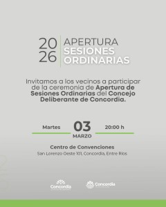 Leido 6 veces El próximo martes 3 de marzo, la ciudad de Concordia vivirá una de sus jornadas institucionales más trascendentes con el inicio de un nuevo período de sesiones ordinarias. Ante la relevancia del acto, el cuerpo legislativo local ha hecho extensiva una invitación a toda la comunidad para participar de la ceremonia, que tendrá lugar a las 20:00 horas en el Centro de Convenciones, ubicado en San Lorenzo Oeste 101. El eje central del encuentro será el mensaje que brindará el Intendente Francisco Azcué ante los ediles, funcionarios de distintos niveles y la ciudadanía presente. Se prevé que el mandatario realice un balance de su gestión hasta la fecha y, fundamentalmente, exponga los lineamientos estratégicos y los proyectos de ordenanza que marcarán el rumbo gubernamental durante el presente año. Esta convocatoria busca jerarquizar la apertura de la actividad parlamentaria a través del acompañamiento de los vecinos, quienes podrán conocer de primera mano la hoja de ruta trazada para el desarrollo local. De este modo, la presencia ciudadana en el recinto no solo otorgará el marco institucional adecuado, sino que reafirmará el compromiso con la transparencia y el debate democrático que la ciudad demanda para su crecimiento. Fuente: Prensa y Difusión Concejo Deliberante de Concordia