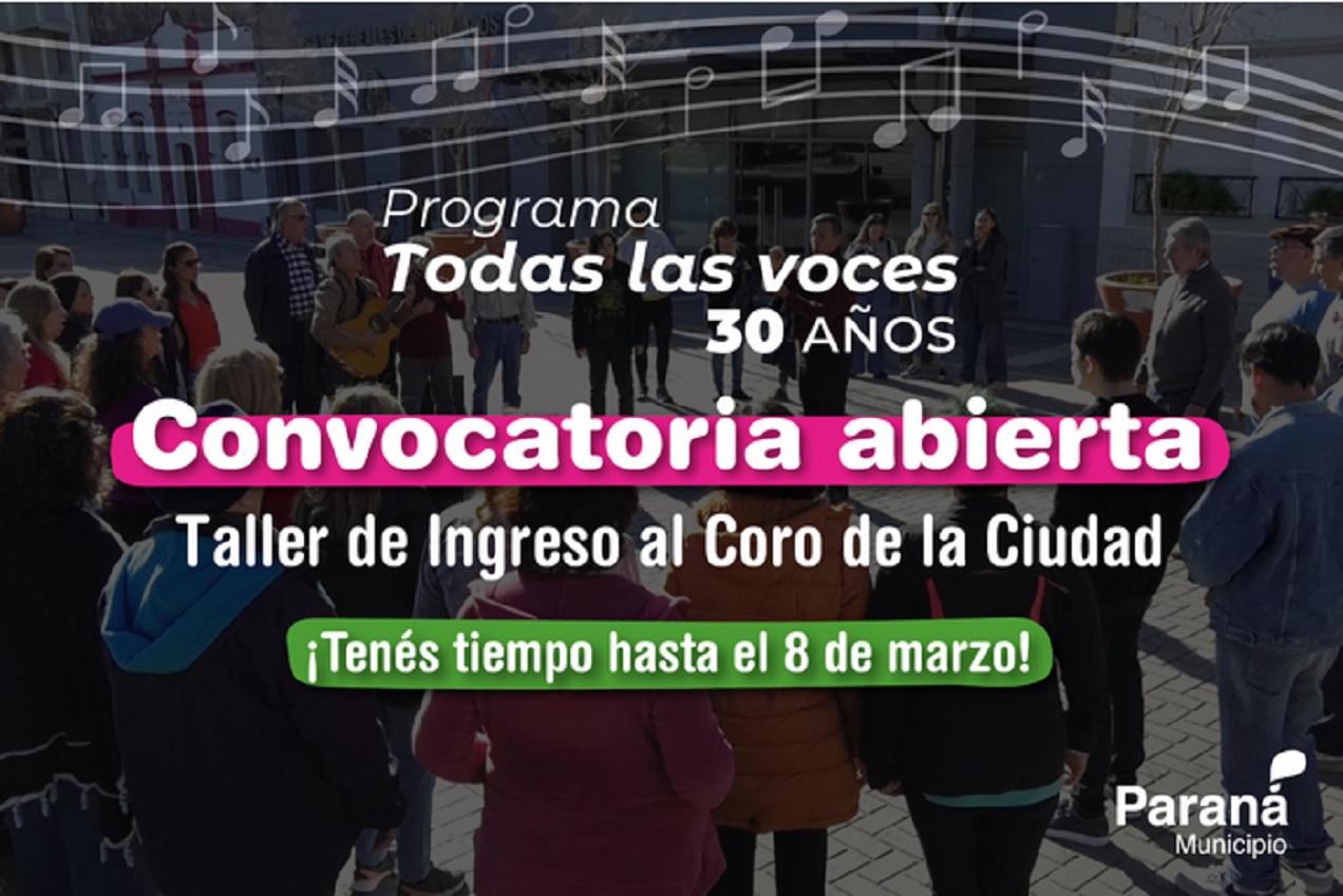Se podrán realizar hasta el domingo 8 de marzo. El taller comenzará el lunes 9 de marzo y se desarrollará durante un mes. El Coro de la Ciudad integra a vecinos en una experiencia artística y promueve la formación integral a través del canto colectivo. La convocatoria de la Municipalidad está destinada a personas mayores de 18 años que cuenten con voz sana, flexibilidad vocal, empatía tímbrica con el conjunto coral y facilidad de aprendizaje auditivo. Se solicita compromiso con la asistencia y puntualidad a los ensayos. El taller se realizará los días lunes de 19:30 a 21:30 horas, en el Centro Cultural Juan L. Ortiz (Bv. Racedo 250) y los jueves de 20 a 21:30 horas, en la Escuela Municipal de Danza (25 de junio 54). El Coro de la Ciudad, creado en 1996 en el marco del programa municipal Todas las Voces, sostiene como premisa el fomento del canto comunitario e integra a vecinos y vecinas en una experiencia artístico-cultural que promueve la formación integral e inclusiva a través del canto colectivo. A lo largo de su trayectoria compartió presentaciones con la Orquesta Sinfónica de Entre Ríos y con la Banda Militar de Música de la II Brigada Aérea de Paraná, además de participar en encuentros corales provinciales y nacionales. Entre sus producciones se destacan el CD Encanto (2006), el documental El Coro de mi Ciudad (2010) y el CD Coro de la Ciudad 22 años (2018), junto a diversas realizaciones audiovisuales. Actualmente, el organismo se encuentra bajo la dirección de Eliseo Almada y celebra el 30º aniversario del programa que le dio origen. Las inscripciones pueden realizarse a través del siguiente formulario: http://docs.google.com/forms/d/e/1FAIpQLSe6NOMbjlbOG86U_KioRFbAqxsHxmoVQWjRTk0Zpg-8oXhSXA/viewform?usp=dialog