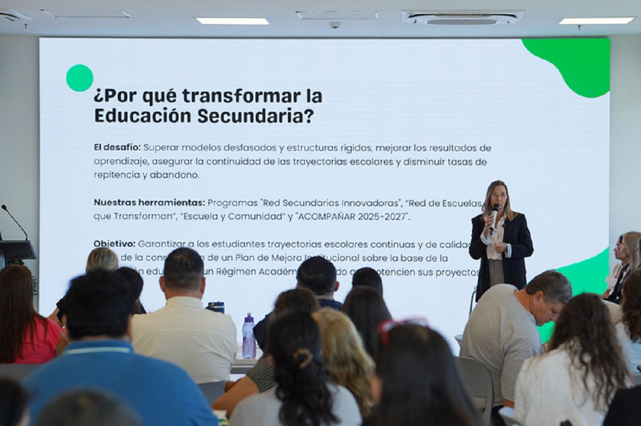 Organizado por los equipos de las direcciones de Educación Secundaria y de Educación de Gestión Privada del CGE, el encuentro tuvo como objetivo presentar y socializar los lineamientos nacionales y jurisdiccionales del Programa Red de Secundarias Innovadoras. La iniciativa busca fortalecer las capacidades institucionales de las escuelas y promover espacios de intercambio y reflexión entre directivos, supervisores, docentes y otros actores del sistema educativo. De la reunión de trabajo participaron las vocales del CGE, Elsa Chapuis y Carla Duré; la directora General de Planeamiento Educativo, Marianela Müller; los directores de Educación de Gestión Privada, Judith Trembeki; de Educación Secundaria, Omar Osuna; Educación Física, Belén Nesa; de Jóvenes y Adultos, Andrea Gutiérrez; de Educación Especial, Alexia Mors; y de Educación Técnico Profesional, Claudia Mariela Geist, subdirectores y coordinadores. Durante la apertura, Müller destacó la importancia del trabajo colectivo para impulsar cambios en el nivel secundario. "La escuela secundaria es una política prioritaria para nuestra provincia, la revisión de su organización, las prácticas docentes y las trayectorias de los estudiantes, los contenidos son temas claves para llevar adelante un proceso de transformación. Hablar de innovación en la escuela secundaria también es hablar de liderazgo: no hay innovación ni transformación posible sin conducción y organización institucional", afirmó. Asimismo, remarcó que "pensar la innovación de manera colectiva es fundamental en esta etapa y que, para llevarla adelante, necesitamos construir acuerdos, redes y asumir este proceso con compromiso". En el marco de la jornada también se desarrolló un taller formativo sobre gestión de datos, a cargo de Ivana Juynevich, magíster en Educación e integrante del equipo técnico nacional. La especialista trabajará a lo largo del año junto a los equipos escolares de 63 instituciones (las 31 iniciadoras y 32 adherentes que se incorporan en mayo) de gestión estatal y privada de la provincia, iniciativa que busca impactar positivamente en las trayectorias educativas de más de 15.000 estudiantes. Al respecto, la directora de Educación de Gestión Privada, Judith Trembeki, señaló que "el valor agregado de este programa es que se trata de una red que comenzamos a construir el año pasado y que ahora se amplía a partir de los lineamientos nacionales. Para ello es necesario abrir nuevos caminos que respondan a la realidad actual". En ese sentido, explicó que durante el encuentro se presentó el plan jurisdiccional basado en una nueva organización institucional y en un régimen académico renovado. Por su parte, el director de Educación Secundaria, Omar Osuna, subrayó la importancia de repensar la estructura curricular desde una perspectiva más situada y flexible. "Esto permitirá habilitar nuevas construcciones pedagógicas con la participación de profesores, asesores pedagógicos, tutores, preceptores y equipos directivos", señaló. La Red en la provincia A partir de un diagnóstico territorial liderado por supervisores y equipos técnicos, las direcciones de nivel y modalidades del CGE identificaron escuelas de gestión estatal y privada que se destacan por sus proyectos institucionales, su liderazgo pedagógico o su vínculo activo con la comunidad. El objetivo es que estas instituciones funcionen como referentes dentro del sistema educativo, permitiendo construir conocimiento teórico a partir de las prácticas y ofreciendo experiencias que orienten los procesos de transformación en otras escuelas. En este marco, el primer encuentro formativo se propuso avanzar en el diseño de proyectos de innovación basados en la realidad de cada institución participante, consolidando una red que durante 2026 tendrá representación en todo el territorio provincial. Por mayor información comunicarse hay correo rsi.secundaria.cge@entrerios.edu.ar