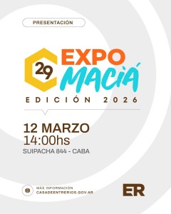 Leido 7 veces El próximo 12 de marzo, a las 14 horas, la Casa de Entre Ríos, ubicada en Suipacha 844 CABA, será sede de la presentación oficial de la 29° Fiesta Nacional de la Apicultura y Expo Apícola del Mercosur Expo Maciá, uno de los encuentros productivos más relevantes del sector apícola de la región. Durante la presentación se darán a conocer las principales actividades, novedades y propuestas de la nueva edición del evento, que se realizará los días 20, 21 y 22 de marzo en la ciudad de Maciá y que cada año convoca a productores, emprendedores, instituciones y público interesado en el desarrollo de la apicultura. Expo Maciá celebra la producción de miel y otros productos derivados de la colmena, promoviendo el intercambio de conocimientos, la innovación tecnológica y la difusión del trabajo de los productores apícolas. La programación de la fiesta incluirá concursos, exposiciones, espectáculos musicales, capacitaciones y espacios de encuentro para el sector productivo, consolidando a Maciá como uno de los principales polos apícolas del país.