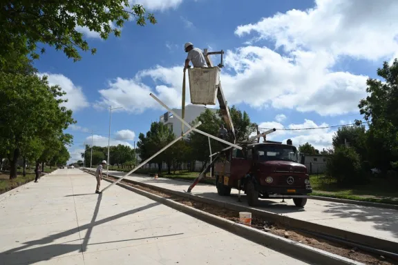 Instalan columnas de luces en el tramo que se reconstruye del boulevard Martínez La Dirección de Energía, a cargo de la Secretaría de Desarrollo Territorial e Infraestructura, instaló siete de las ocho estructuras de alumbrado público en los canteros centrales del sector intervenido del boulevard Martínez, en el tramo que conecta Urquiza al Oeste con Gervasio Méndez, una extensión cercana a los 250 metros lineales. Cada soporte cuenta con dos extensiones habilitadas para llevar dos equipos LED, orientados hacia cada una de las calzadas para garantizar cobertura lumínica uniforme. Cuatro unidades quedaron emplazadas en el cantero central comprendido entre Gervasio Méndez y San Martín, mientras que las tres restantes se ubicaron en la plazoleta central que se ubica entre San Martín y Urquiza al Oeste. Los próximos días se sumará otra columna y los respectivos soportes para los equipos LED de las dos últimas. El operativo se ejecutó con una cuadrilla integrada por cuatro agentes de la Dirección de Energía y una grúa perteneciente al área. En los próximos días se realizará también el tendido eléctrico, para el cual ya se dispuso un conducto subterráneo que evita intervenciones sobre la superficie construida en los últimos meses. Una vez finalizada la instalación de columnas y cableado, se incorporarán los artefactos lumínicos. Estas tareas forman parte de la construcción y pavimentación del boulevard Martínez, entre Urquiza al Oeste y Gervasio Méndez, una intervención destinada a consolidar la conectividad entre los barrios 348, 338 y 120 Viviendas con uno de los accesos más relevantes del sector oeste. En este sentido, la renovación del boulevard Martínez no solo implica la ejecución de una calzada moderna, sino que además supone ordenar un sector específico, mejorar estándares de seguridad, optimizar la circulación y fortalecer la integración entre barrios y accesos estratégicos. Cada componente, desde la estructura vial hasta el sistema de iluminación y drenaje, responde a un criterio técnico que prioriza durabilidad, funcionalidad y planificación urbana a largo plazo. Los detalles de la obra del Boulevard Martínez Con una inversión oficial que ronda los 400 millones de pesos, el proyecto apunta a optimizar la estructura vial y jerarquizar un eje estratégico dentro del entramado urbano. Previo al inicio de los trabajos que se realizaron durante los últimos meses, parte del corredor carecía de mejoras y otro sector presentaba un pavimento de hormigón con deterioro avanzado. Ante ese escenario, se demolió la totalidad del material existente y se ejecutó una base nueva para sostener una estructura renovada. La iniciativa contempló la construcción de pavimento rígido de hormigón armado sobre suelo calcáreo estabilizado. El diseño final prevé dos calzadas de 6,50 metros de ancho cada una, separadas por un cantero central de 1,60 metros a lo largo de un desarrollo lineal que alcanza los 246 metros, conforme a los planos y cómputos métricos elaborados por la Secretaría de Desarrollo Territorial e Infraestructura. El plan incorpora además intervenciones complementarias con personal municipal, entre ellas la instalación de alumbrado central, actualmente en ejecución. Asimismo, el proyecto incluye la construcción de dos cámaras de captación que cumplirán la función hidráulica del dispositivo original y garantizarán un adecuado escurrimiento pluvial.