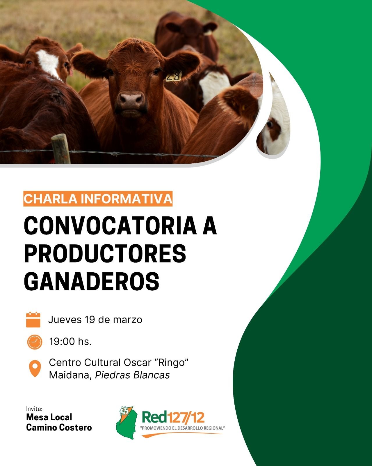 Desde el Área de Produccion de la Municipalidad de Piedras Blancas se invita a productores ganaderos a una charla informativa sobre los aportes que desde la Red 127 y 12 se pueden brindar para mejorar la producción ganadera de la zona tanto bovinos, ovinos y/o caprinos. La misma se realizará el próximo jueves 19 de marzo a las 19 hs en el Centro Cultural Oscar "Ringo" Maidana.