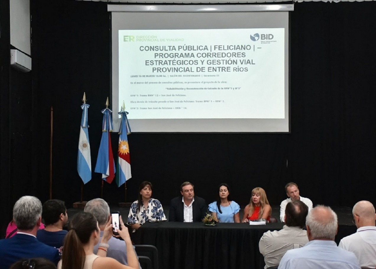 Se realizó la consulta pública para la mejora de la red vial del norte entrerriano, una intervención que permitirá potenciar el desarrollo productivo de la región y que será financiada por el Banco Interamericano de Desarrollo (BID). El gobierno provincial, a través de la Dirección Provincial de Vialidad (DPV), llevó adelante la Casa de la Cultura y del Bicentenario de la ciudad de Feliciano la instancia participativa donde se dieron a conocer los detalles técnicos del anteproyecto para la rehabilitación de las rutas provinciales 1 y 2. Se trata de una obra, muy anhelada y esperada, por la ciudadanía de los departamentos La Paz, Feliciano, Federación y Federal. "Es una gran apuesta y decisión política del gobernador, Rogelio Frigerio, poner en valor obras necesarias para estos departamentos y continuar con una firme agenda de priorizar la obra pública para brindar una mejor conectividad a productores y vecinos, establecimientos educativos, centros de salud, destacamentos policiales y todos los actores sociales", enfatizó el titular de la DPV, Exequiel Donda. En ese marco, agregó: "Estas consultas públicas son muy importantes porque permiten que la ciudadanía se interiorice de cada proyecto de obra y pueda realizar consultas o plantear dudas sobre los trabajos a llevar adelante". En cuanto a la intervención prevista, el proyecto contempla la rehabilitación y reconstrucción de calzada de la Ruta Provincial N° 1 y N° 2, incluyendo la Ruta Provincial N° 1 en el tramo Ruta Nacional N° 12 - San José de Feliciano, la obra de desvío de tránsito pesado a San José de Feliciano en el tramo Ruta Provincial N° 1 - Ruta Provincial N° 2, en distrito Manantiales, y la Ruta Provincial N° 2 en el tramo San José de Feliciano - Ruta Nacional N° 14. El objetivo de los trabajos es mejorar las condiciones de seguridad y confort para los usuarios, además de prolongar la vida útil del camino mediante la preservación de la estructura existente. Por último, del encuentro participaron autoridades locales y legislativas, junto a vecinos, productores y representantes de distintas instituciones de los departamentos involucrados.
