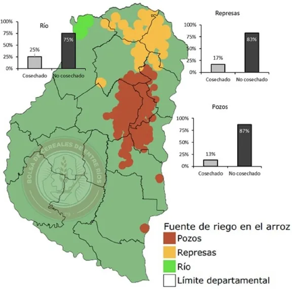 Avanza la cosecha de arroz en Entre Ríos En función de consultas realizadas a la Red de Colaboradores del SIBER, vinculados al sector arrocero, se estimó que a nivel provincial se cosechó el 19% del área implantada. Los mayores progresos se registran en el norte del departamento La Paz (toma de agua de ríos), mientras que en la zona de bajo riego por pozo el avance alcanza solo el 13%. Los colaboradores reportan que hay muchos lotes parcialmente cosechados, lo cual dificulta estimar un rendimiento promedio provincial. Con estas condiciones, en una primera aproximación, se podrían detectar rendimientos que en general oscilan entre 7.100 a 7.400 kg/ha, lo que representaría una caída interanual de entre el 10 y el 15%.