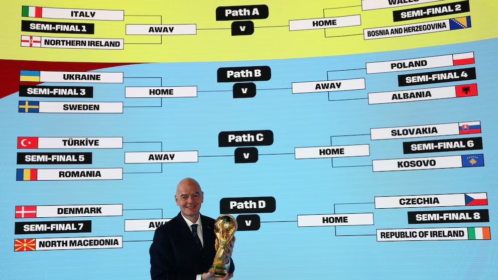 Los dos cupos internacionales y los cuatro disponibles para UEFA se definirán en esta Fecha FIFA El Mundial 2026 que organizarán en conjunto México, Estados Unidos y Canadá tendrá una semana por demás especial. Los últimos seis integrantes de esta renovada Copa del Mundo con 48 seleccionados completará sus grupos con los últimos clasificados de los Repechajes Internacionales y de Europa. Desde este jueves 26 de marzo, 22 selecciones pujarán por los últimos seis boletos disponibles. La UEFA realizará ocho cruces de semifinales a partido único que definirán a los equipos que pelearán por los cuatro pases que todavía tiene disponibles esa federación. El Grupo A del Mundial, compuesto por el anfitrión México, Sudáfrica y Corea del Sur, espera por República Checa, Irlanda, Dinamarca o Macedonia del Norte. Mientras que el Grupo B de Canadá, Qatar y Suiza sumará a sus filas a Gales, Bosnia y Herzegovina, Italia o Irlanda del Norte. La Zona D, de Paraguay, Estados Unidos y Australia, verá unirse a Eslovaquia, Kosovo, Turquía o Rumania. Finalmente, el Grupo F que ya tiene a Países Bajos, Japón y Túnez se cerrará con la incorporación de Ucrania, Suecia, Polonia o Albania. Los otros dos pases serán para los del Repechaje Internacional que tendrá un formato de disputa levemente diferente. Las semifinales en distintas sedes de México entre Bolivia-Surinam y Nueva Caledonia-Jamaica pondrán a los últimos dos seleccionados que afrontarán las finales que ya tienen clasificadas a Irak y República Democrática del Congo por estar mejor posicionadas en el Ranking FIFA. En ese contexto, el Grupo I de Francia, Senegal y Noruega contará con Irak, Bolivia o Surinam. Mientras que el K de Portugal, Colombia y Uzbekistán espera por República Democrática del Congo, Nueva Caledonia o Jamaica. LOS DETALLES DEL REPECHAJE UEFA AL MUNDIAL 2026 Las cuatro llaves del Repechaje Europeo que repartirán los últimos boletos de UEFA A diferencia del Repechaje Internacional, que se celebrará en México como única sede, la repesca europea definió las localías por sorteo. Los 16 participantes se dividieron en cuatro bombos de cuatro equipos cada uno según su ranking y se repartieron en cuatro eliminatorias. Los dos primeros bolilleros tenían garantizado jugar la semifinal de su llave en condición de local, pero no lo tenían asegurado en las finales. El ejemplo más claro es Italia, ya que la Azzurra ocupó el Bombo 1, recibirá a Irlanda del Norte y, de ganar, ya quedó resuelto que visitará al vencedor de Gales o Bosnia y Herzegovina por un lugar en la Copa del Mundo. Esta misma situación se repetirá en otros dos mini cuadros. El dueño del choque Turquía-Rumania viajará a Bratislava o Pristina para medirse a Eslovaquia o Kosovo, mientras que República Checa o Irlanda recibirán en Praga o Dublín, respectivamente, a Dinamarca o Macedonia del Norte. Ucrania es la única selección del Bombo 1 que podría definir todo de local, aunque con el asterisco de que ejercerá esa condición en Valencia (España), ya que no lo puede hacer en su país por el conflicto con Rusia. En primera instancia, deberá superar a Suecia y el vencedor de ese cruce será anfitrión de Polonia o Albania. Todos los duelos programados son a partido único con prórroga y penales en caso de igualdad. LA AGENDA DE LAS SEMIFINALES DEL REPECHAJE PARA EL MUNDIAL 2026 Jueves 26 de marzo 14.00: Turquía vs. Rumania (Estambul, Turquía) 16.45: Eslovaquia vs. Kosovo (Bratislava, Eslovaquia) 16.45: Gales vs. Bosnia y Herzegovina (Cardiff, Gales) 16.45: Italia vs. Irlanda del Norte (Bérgamo, Italia) 16.45: Ucrania vs. Suecia (Valencia, España) 16.45: Polonia vs. Albania (Varsovia , Polonia) 16.45: República Checa vs. Irlanda (Praga, República Checa) 16.45: Dinamarca vs. Macedonia del Norte (Copenhague, Dinamarca) 19.00: Bolivia vs. Surinam (Monterrey, México) Viernes 27 de marzo 00.00: Nueva Caledonia vs. Jamaica (Guadalajara, México) *Horarios de Argentina Las cuatro llaves del Repechajes de UEFA (Foto: Reuters/Denis Balibouse) LA AGENDA DE LAS FINALES DEL REPECHAJE PARA EL MUNDIAL 2026 Martes 31 de marzo Grupo A del Mundial: el ganador de República Checa/Irlanda vs. Dinamarca/Macedonia del Norte (Dublín o Praga) Grupo B del Mundial: el ganador de Gales/Bosnia y Herzegovina vs. Italia/Irlanda del Norte (Cardiff o Zenica) Grupo D del Mundial: el ganador de Eslovaquia/Kosovo vs. Turquía/Rumania (Bratislava o Pristina) Grupo F del Mundial: el ganador de Ucrania/Suecia vs. Polonia vs. Albania (Valencia o Estocolmo) Grupo I del Mundial: el ganador de Irak vs. Bolivia/Surinam (Monterrey) Grupo K del Mundial: el ganador de Congo vs. Nueva Caledonia/Jamaica (Guadalajara) Irak y República Democrática del Congo se clasificaron directamente a las finales del Repechaje internacional por estar mejor ubicados en el Ranking FIFA (Foto: Reuters/Denis Balibouse) LOS GRUPOS DEL MUNDIAL 2026 Los grupos del Mundial a la espera de los Repechajes