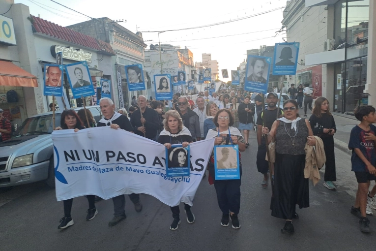 A cincuenta años del golpe de Estado del 24 de marzo de 1976, una nutrida columna de vecinos, vecinas y familiares, se concentró en 25 de Mayo y Rocamora y marchó por el centro de Gualeguaychú. La convocatoria fue impulsada por la asociación Madres de Plaza de Mayo Gualeguaychú junto a organizaciones sociales. Con tambores, pancartas y carteles con los rostros de los 37 detenidos desaparecidos de la ciudad, la consigna fue unánime: Son 30.000. Nunca Más. Ni un paso atrás. Al frente de la multitud, marcharon los familiares de desaparecidos y/o asesinados durante la última dictadura militar argentina. Hoy se cumplen 50 años del inicio de la dictadura genocida. Medio siglo de aquel 24 de marzo de 1976 que inauguró una de las etapas más oscuras de nuestra historia. Argentina, como nación, fue sometida a un retroceso histórico en todos los aspectos: en sus derechos y libertades elementales, al VER sufrir la violencia, la represión y el terror estatal. En su economía, al ser entregada al poder económico para uso y despojo a través del endeudamiento externo y a la desindustrialización, expresaron los oradores dieron lectura al documento local. En estos 50 años la patria ha visto al crimen, la impunidad y la mentira deambular a sus anchas por los pasillos de gobierno, del poder judicial y de los medios de comunicación. Vio al Estado en los Centros Clandestinos de Detención, Tortura y Exterminio, sometiendo a personas a las peores atrocidades posibles, asesinando y robando bebés. Vio a miles de argentinos en las cárceles injustas, mientras otros se exiliaban para salvar sus vidas y las de sus familias. No ha faltado infamia por cumplir, agregaron. Además, sostuvieron que Gualeguaychú padeció en carne propia el proceso genocida, con 37 gualeguaychuenses detenidos desaparecidas o asesinados. Nuestra comunidad busca también a dos nietos robados: a Pedro, hijo de Blanquita Angerosa, nacido en cautiverio en un Centro Clandestino. Al hijo o hija de Marta Bugnone, que estaba embarazada al momento de su desaparición. Y tampoco se supo más nada de ellas. Pero la patria también ha sido testigo del coraje y la dignidad de las Madres de Plaza de Mayo que, sin especular ni recular ni medir correlaciones de fuerzas, iniciaron su lucha, hermosa y fértil lucha, en plena dictadura, cuando más se necesitaba su luz. La patria fue también testigo de los trabajadores reorganizándose en la resistencia cotidiana, en las fábricas y lugares de trabajo. Los vio parando y marchando en pleno gobierno militar por paz, pan y trabajo. La patria ha visto también la Guerra de Malvinas, a la que debemos memoria por sus soldados, verdaderos héroes argentinos que lucharon por la soberanía argentina, no por los altos mandos que actuaron como irresponsables, aventureros y vende patria que eran, declararon. En otro fragmento del discurso, afirmaron Hoy como ayer, seguimos luchando por justicia, contra la impunidad de los militares genocidas, y de los empresarios y los jerarcas de la Iglesia cómplices de los peores crímenes de lesa humanidad a quienes no supimos juzgar ni condenar. Y proclamaron, El presente es de palmario retroceso en todo sentido, con paisajes y personajes repetidos, que no sólo niegan la verdad de los delitos cometidos por los genocidas, sino que incluso los reivindican. A ello se suman los beneficios de libertad, como la promesa de un indulto, lo cual representa un quiebre directo con el pacto democrático de 1983 y una afrenta a la Memoria de los 30.000 desaparecidos, a la par que violan la jurisprudencia argentina y los pactos internacionales. Asimismo, señalaron que Esta realidad nos asfixia. Nos parece que el presente se impone para siempre y que los monigotes del poder se llevarán puesta la historia. Pero escupir odio no es gratis, la vuelta es larga y los protagonistas de esta aventura libertaria, por acción u omisión, sepan que se van a arrepentir y que tarde o temprano las van a pagar. Y sostuvieron, Pero aquí estamos. Aquí estamos y seguiremos estando. Con nuestras fuerzas y nuestra rabia, con nuestras heridas y experiencias, con amor y esperanza, con nuestros hijos, nuestras madres y abuelas. Por eso ¡Aquí seguiremos, en las calles y en las plazas, marchando! A 50 años del golpe de Estado, organizándonos, bordando memoria, y luchando por la reconstrucción de un proyecto popular, para volver a tener un gobierno que quiera, valore y cuide a su pueblo. Seguiremos aquí, haciendo flores de las penas y heridas, para sembrar de futuro nuestra tierra, reafirmaron tras los aplausos de los presentes, y concluyeron ¡Con el amor como bandera, siempre! Por nuestros 30 mil compañeros y compañeras detenidos - desaparecidos. Presentes.