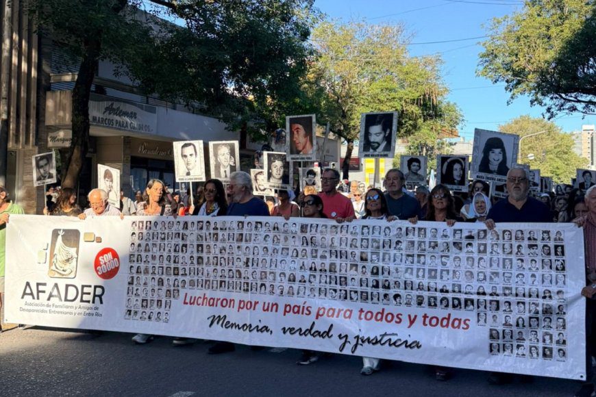 Paraná Familiares de desaparecidos y sobrevivientes, víctimas, la Multisectorial por los Derechos Humanos de la ciudad, agrupaciones y partidos políticos, sindicatos, organizaciones sociales y cientos de personas que asisten de manera independiente se movilizaron desde la Plaza Sáenz Peña hasta la Plaza Alvear. La convocatoria de este 24 de Marzo es especial al conmemorarse medio siglo desde el comienzo del régimen de terror que implementó la Junta Militar desde 1976 hasta la recuperación de la democracia en 1983. La Multisectorial de Derechos Humanos de Paraná convocó a la movilización con la consigna central Que digan dónde están. El énfasis estuvo puesto en el reclamo a los responsables militares, políticos y civiles de las desapariciones de personas y de los robos de bebés para que revelen información que permita encontrar los cuerpos ocultados durante aquellos años y recuperar las identidades de los hijos y nietos sustraídos. La convocatoria insistió a su vez con la premisa Ni olvido ni perdón y renovó la advertencia tradicional de la fecha: Fascistas y genocidas Nunca Más cerraba la invitación a marchar este martes en al capital entrerriana. La marcha estuvo encabezada por organizaciones de Derechos Humanos como H.I.J.O.S. Regional Paraná, la Asociación de Familiares y Amigos de Desaparecidos de Entre Ríos (AFADER), los ex presos de La Solapa, la Liga Argentina por los Derechos del Hombre, Memoria Colectiva, y la Asamblea Permanente por los Derechos Humanos (APDH), entre otras. También participaban columnas de los partidos Justicialista, de los Trabajadores Socialistas, el Movimiento Socialista de los Trabajadores, Comunista, Comunista Revolucionario; sindicatos de trabajadores estatales, docentes universitarios y trabajadores de Balizamiento; organizaciones juveniles como La Cámpora, entre muchas otras. La Marcha avanzó por calles del centro paranaense hasta terminar sobre Laprida, donde el escenario está montado frente a la Plaza Alvear y de espaldas al Museo de Bellas Artes, un icónico ex centro clandestino de detención de la ciudad durante la dictadura. Allí se leyó el clásico documento de cada 24 de Marzo, donde además de las consignas históricas de Memoria, Verdad y Justicia se esperan fuertes críticas a las políticas y el discurso del gobierno de La Libertad Avanza y su postura negacionista sobre el Terrorismo de Estado de 1976 a 1983. Concordia La concentración partió desde la intersección de calle Salta y Damián P. Garat. Las personas marcharon hasta la plaza Urquiza, donde se leyó el documento consensuado entre las organizaciones. Fue notoria la ausencia de agrupaciones radicales en la marcha. Gualeguaychú Gualeguaychú volvió a marchar este martes 24 de marzo, con las banderas en alto de Memoria, Verdad y Justicia. Las Madres de Plaza de Mayo de la ciudad invitaron a toda la comunidad a participar. La concentración fue en la esquina de 25 de Mayo y Rocamora, desde donde la columna avanzó hasta Plaza San Martín. A lo largo del recorrido, se realizaron pequeñas paradas con intervenciones artísticas. Además, como cada año, los familiares portaron los carteles con los rostros de las 37 personas desaparecidas de la ciudad. La consigna central de la jornada fue: Son 30.000. Nunca más. Una vez en la plaza, se leeyó un documento elaborado por las Madres con adhesión de numerosas organizaciones sindicales, sociales y políticas de la ciudad. Luego, comenzó un festival artístico con actuaciones de músicos y jóvenes de la ciudad. Colón En Colón, la gente marchó desde la plaza San Martín hasta el Espacio de la Memoria, ubicado en el puerto, donde se leyó el documento en ocasión de la fecha y se arrojaron flores conmemorativas.