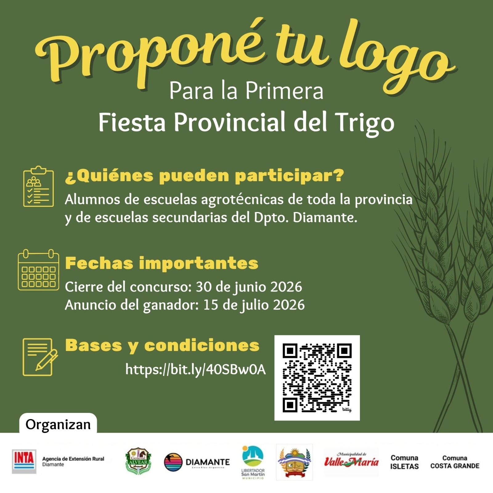 En el marco de la organización de este evento, que se realizará en Valle María (departamento Diamante), se abrió la convocatoria para crear la identidad visual oficial de la fiesta. La iniciativa es impulsada por el Instituto Nacional de Tecnología Agropecuaria (INTA Diamante EEA Paraná) junto a gobiernos locales, y busca representar la producción triguera, su tradición y su desarrollo tecnológico en Entre Ríos. ¿Quiénes pueden participar? Estudiantes de Escuelas de Educación Agrotécnica de toda la provincia, en forma grupal y con acompañamiento docente. También se invita especialmente a escuelas secundarias del departamento Diamante. ¿Qué se propone? Diseñar un isologotipo original e inédito que refleje: el cultivo de trigo el territorio la cultura local ? Recepción de trabajos: hasta el 30 de junio de 2026 ? Anuncio del ganador: 15 de julio de 2026 Premio Dos computadoras de escritorio para la escuela ganadora Reconocimiento a estudiantes y docente tutor La Fiesta Provincial del Trigo se realizará en octubre, entre el 15 y el 17, y convocará a productores, instituciones, escuelas y la comunidad en torno a uno de los cultivos emblemáticos de la región. Una propuesta que integra producción, identidad y educación, fortaleciendo el desarrollo entrerriano. Bases y condiciones: https://www.argentina.gob.ar/sites/default/files/2026/03/bases_y_condiciones_concurso_isologotipo_-_fiesta_provincial_del_trigo.pdf