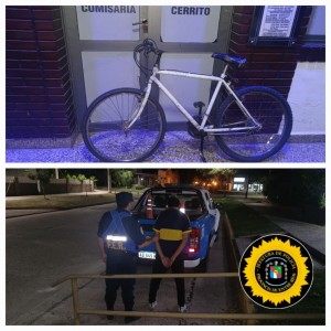 Leido 4 veces Personal de Comisaria Cerrito, este jueves a la noche, recibió una denuncia por delito de Hurto de una bicicleta, sustraída del frente de un local comercial ubicado en calle Florida. Según dichos del denunciante, empleado del local comercial, la bicicleta rodado 26 marca MTB, color blanca, había sido dejada sin ninguna medida de seguridad en el frente del negocio. Tras tomar conocimiento personal policial se aboco a la búsqueda, al mismo tiempo que se examinaban cámaras de acceso a la localidad, siendo localizada minutos más tarde en Ruta Nacional Nº 12 a la altura del acceso a Aldea Santa María, en poder de una persona de sexo masculino de 26 años de edad, oriundo de la Provincia a de Santa Fe. Ante lo sucedido se le informo al Fiscal de Investigación y litigación, quien dispuso que la persona, quede detenida y la bicicleta sea formalmente secuestrada y posteriormente entregada a su propietario. Fuente: Comisaría Cerrito