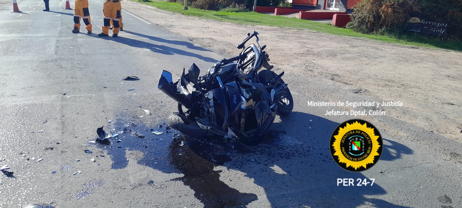 En horas de la tarde, personal policial dependiente de Jefatura Departamental Colón tomó intervención en Ruta Ex 26 y Calle Juan Manuel de Rosas, donde por causas que se tratan de establecer se produjo un siniestro vial. Según se confirmó a Génesis24, un vehículo marca Peugeot Partner, conducido por un hombre de 64 años de edad, de nacionalidad paraguaya, quien aparentemente ingresaba a la ruta desde la segunda arteria mencionada, en sentido Este a Oeste, habría sido impactado en su lateral izquierdo por una Motocicleta marca Kawasaki Ninja 650R, guiada por un hombre de 37 años de edad, quien se desplazaba por dicha ruta en sentido Sur a Norte. Como consecuencia del impacto, el conductor del rodado de menor porte fue trasladado al nosocomio local, donde tras ser examinado por los profesionales intervinientes, se determinó que presentaba lesiones de carácter graves, consistentes en luxofractura de codo izquierdo, de resolución quirúrgica. En el lugar intervino personal de Inspección Municipal, procediendo a la retención del vehículo de mayor porte, debido a que su conductor arrojó resultado positivo en test de alcoholemia.