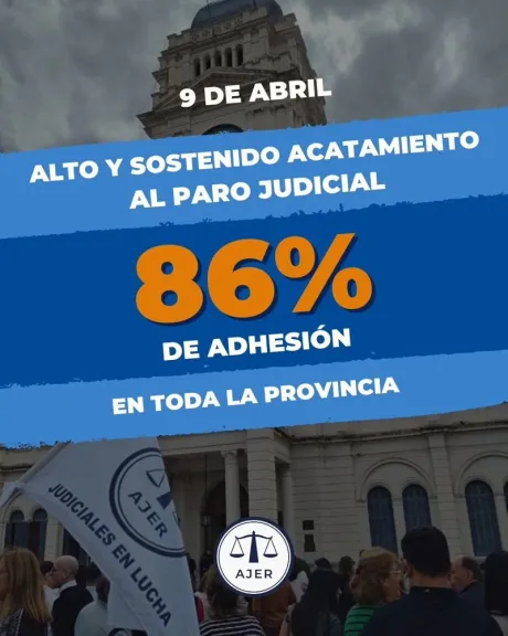 Con 86% de adhesión al paro, los judiciales renovaron sus reclamos salariales y previsionales La medida había sido definida en Plenario Provincial, como parte de una serie de acciones que incluyeron también un paro realizado el 31 de marzo. Desde AJER destacaron que el fuerte nivel de acatamiento registrado reflejó la unidad y el compromiso del sector, así como la necesidad urgente de obtener respuestas a las demandas planteadas. Seguimos exigiendo la recomposición salarial y la defensa del 82% móvil para jubilados y jubiladas. También reclamamos por el pago en tiempo y forma de los salarios, el reconocimiento del título para todos los empleados y empleadas, y el adicional por funciones especiales, indicó la entidad gremial. Además se advirtió que la adhesión del 86% registrada en esta nueva jornada evidencia el respaldo de las bases a las medidas adoptadas y reafirma la determinación de continuar con el plan de lucha hasta lograr respuestas satisfactorias a sus demandas. (APFDigital)