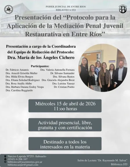 Presentarán el Protocolo para la Aplicación de la Mediación Penal Juvenil Restaurativa El miércoles 15 de abril se presentará el Protocolo para la Aplicación de la Mediación Penal Juvenil Restaurativa en Entre Ríos. Será a partir de las 11 en la sala de lectura de la Biblioteca del Superior Tribunal de Justicia de Entre Ríos (STJER), ubicada en el subsuelo de los Tribunales de Paraná (Laprida 251). La presentación estará a cargo de la coordinadora del Equipo de Redacción del Protocolo, María de los Ángeles Cichero, y contará con la participación de integrantes del equipo interviniente en su elaboración, pertenecientes a la Oficina de Medidas Alternativas del Poder Judicial de Entre Ríos. El ingreso será libre y gratuito, y la actividad está dirigida a todas aquellas personas interesadas en la temática, otorgándose certificación de asistencia. Las inscripciones pueden realizarse a través del siguiente formulario digital: https://forms.gle/3vFZmd5J3ZTPe8fo7. (APFDigital)