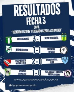 Leido 5 veces Este domingo se disputó la tercera fecha de Primera División de la Copa Desiderio Godoy y Eduardo Cebolla Seimandi, organizado por la Liga de Fútbol de Paraná Campaña. En Cerrito, el verde le ganó 3 a 1 a Deportivo Bovril. Además, Juventud Unida y Deportivo Tuyango empataron 1 a 1; Independiente Football Club le ganó 2 a 0 a Unión Football Club; Juventud Sarmiento hizo lo propio ante la Asociación Social y Deportiva Diego Maradona por 1 a 0, y Viale Football Club le ganó 3 a 0 a Atlético Sarmiento. En tanto, Cañadita Central de Seguí cayó estrepitosamente por 5 a 1 ante Atlético María Grande, Litoral derrotó 3 a 1 Seguí Football Club; Atlético Unión de Viale sufrió una goleada por 8 a 0 ante la Asociación Deportiva y Cultura de Crespo; y Atlético Unión de Crespo marcó diferencias por 3 a 0 ante Deportivo Tabossi. (Fuente: Debate Abierto)
