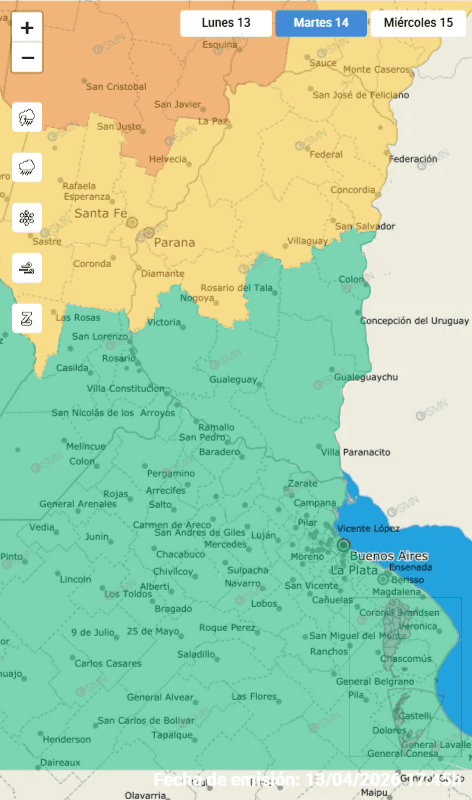 El clima en la provincia de Entre Ríos presentará complicaciones durante las próximas 48 horas. El Servicio Meteorológico Nacional (SMN) emitió un alerta amarillo por tormentas de variada intensidad, lo que motivó a la Dirección de Defensa Civil de la provincia a solicitar a la población extremar los recaudos necesarios. De acuerdo al reporte oficial al que tuvo acceso 7Pagians, el fenómeno climático traerá consigo lluvias y tormentas, algunas de ellas localmente fuertes. Los principales riesgos asociados son la actividad eléctrica, la caída de granizo y, fundamentalmente, ráfagas de viento que podrían alcanzar o superar los 80 km/h. Zonas afectadas: Martes 14 de abril Para la jornada de este martes, el área de cobertura es amplia e incluye a los departamentos de: Concordia, Federación, Federal, Feliciano, San Salvador, La Paz, Villaguay, Paraná, Nogoyá Cronograma para el Miércoles 15 El reporte indica que la inestabilidad persistirá durante la jornada del miércoles, aunque el área de alerta se desplazará principalmente hacia el norte y centro-este de la provincia, afectando específicamente a: Concordia, Federación, Federal, Feliciano y San Salvador.
