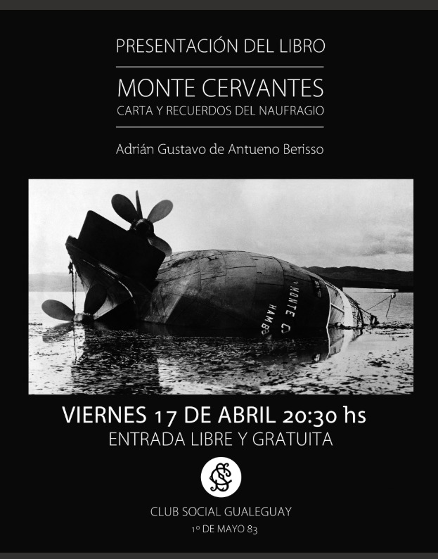 Presentación del libro Monte Cervantes, Carta y Recuerdos del Naufragio, de Adrián Gustavo de Antueno Berisso La Subcomisión de Cultura del Club Social presentará mañana viernes 17 del corriente, a las 20,30 hs., el libro Monte Cervantes- Carta y Recuerdos del Naufragio cuyo autor, que estará a cargo de la exposición, es el Dr. Adrián Gustavo de Antueno Berisso, médico veterinario, oriundo de nuestra ciudad que reside desde hace muchos años en Ushuaia. El autor: Adrián Gustavo de Antueno Berisso nació en Gualeguay el 13 de marzo de 1951. Hijo de Aurora y Osvaldo, ambos pertenecientes a tradicionales familias gualeyas, vivió intermitentemente en su ciudad natal, La Plata, Neuquén y Gualeguay por cuestiones laborales. Su vocación por la escritura lo llevó a redactar varias obras de historia, política, institucionalidad y sobre la pesca en la Tierra del Fuego, Antártida e Islas del Atlántico Sur. Entre ellas se destaca MONTE CERVANTES, CARTA Y RECUERDOS DEL NAUFRAGIO. Cabe acotar que el ingreso por la venta de los libros se destinará como colaboración al Asilo de Ancianos de nuestra ciudad. El libro: nos acerca a una historia tan asombrosa como cierta, hace casi un siglo naufragaba en el Canal Beagle el gigantesco buque Monte Cervantes con 1200 pasajeros a bordo y entre ellos se encontraban varios, precisamente, de Gualeguay. La fascinante trama se va hilando con cartas, poemas, citas bibliográficas, fotos y objetos que reflotan los hechos como un espejismo: el naufragio provocaba la instauración de plena dependencia de sus pasajeros con los escasos habitantes de Ushuaia hasta que acudiera su rescate una semana más tarde. Pero de Antueno va más allá de un prolijo recorrido que explora todos los matices de un hecho del cual solo la mano divina pudo ser sustancial hacedora de su feliz desenlace. Así como fueron recobradas de la profundidad las reliquias del Monte Cervantes, el relato reflota de aquella heroica odisea los valores de humanidad, solidaridad y templanza para que su reapropiación colectiva inspire el rumbo de una sociedad mejor. La presentación tendrá entrada libre y gratuita.