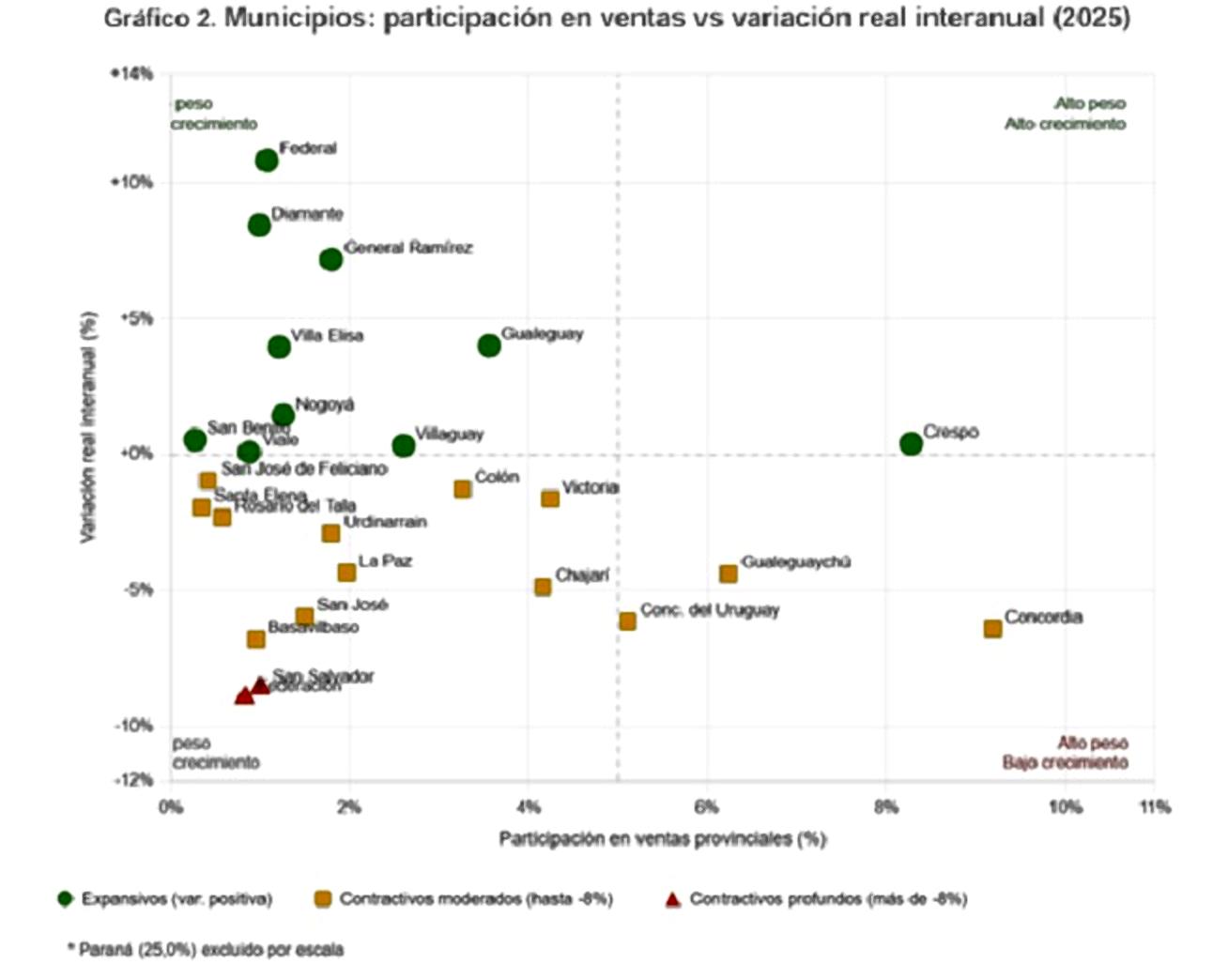 Un informe elaborado por el Centro de Economía Regional y Experimental (CERX), liderado por la exfuncionaria provincial Victoria Giarrizzo, al que accedió Paralelo32, confirma que el comercio de Entre Ríos atravesó en 2025 un nuevo año de retracción. Las ventas registraron una caída del 4,0% en términos reales es decir, descontando el efecto de la inflación en un contexto macroeconómico nacional marcado por la desaceleración del consumo y la recomposición de precios relativos, que afectaron el poder adquisitivo de los hogares durante buena parte del año. El estudio, basado en el análisis de 7.966 empresas distribuidas en 216 rubros y 140 municipios, muestra que la contracción no fue homogénea. Por el contrario, la dinámica del sector estuvo atravesada por fuertes contrastes entre actividades, tamaños de empresas y territorios. Las más leídas Una caída con matices Aunque el resultado global fue negativo, algunos sectores lograron crecer. Entre los rubros con mejor desempeño se destacaron maquinaria y equipos (+11,4%), muebles y artículos del hogar (+4,2%) y reparación de vehículos (+3,8%). También mostraron avances automotores, motos y accesorios (+2,3%), en línea con el fuerte incremento en patentamientos durante el año. Sin embargo, estos sectores tienen una incidencia relativamente baja en la facturación total, lo que limitó su capacidad para compensar la caída general. En contraste, los segmentos de mayor peso estructural explicaron gran parte del retroceso. Supermercados e hipermercados (-8,1%), combustibles (-8,6%) y farmacia (-6,7%) registraron caídas significativas, arrastrando el resultado agregado. También se observaron descensos en indumentaria y calzado (-9,9%), electrodomésticos (-5,7%) y materiales para la construcción (-5,6%), evidenciando la debilidad del consumo de bienes durables. Una excepción dentro de los rubros masivos fue alimentos y bebidas, que creció levemente (+1,1%) y representó el 29,1% del total de ventas, funcionando como amortiguador parcial de la caída. Dos años de retracción Con este resultado, el comercio entrerriano acumula dos años consecutivos de caída real. No obstante, el informe destaca que 7 de los 20 rubros analizados lograron crecer en 2025, lo que refleja que la crisis no fue uniforme sino concentrada en los segmentos de mayor volumen. Además, el crecimiento en maquinaria y equipos sugiere que, pese al contexto adverso, parte del entramado productivo mantuvo decisiones de inversión, una señal relevante hacia adelante. Diferencias según el tamaño de las empresas El desempeño también varió según la escala de los comercios. Las pequeñas empresas fueron las más dinámicas, con un crecimiento real del 1,1%, mostrando mayor capacidad de adaptación. En cambio, las microempresas que representan el 92,6% del total cayeron 4,8%, reflejando el impacto territorial de la crisis. Las medianas registraron la peor performance (-7,6%), mientras que las grandes empresas retrocedieron 5,7%. El informe sugiere que las pequeñas firmas lograron mayor flexibilidad frente a los cambios en la demanda, mientras que las medianas quedaron más expuestas a la caída del consumo. Un mapa desigual: ciudades que empujan y ciudades que caen A nivel territorial, la dinámica fue igualmente heterogénea. Municipios como Federal (+10,8%), Diamante (+8,4%) y General Ramírez (+7,2%) mostraron crecimientos importantes, aunque con bajo peso en el total provincial. En ciudades de tamaño intermedio como Crespo (+0,4%), Nogoyá (+1,4%) y Villaguay (+0,3%), los resultados fueron levemente positivos, contribuyendo a amortiguar la caída. En cambio, los principales centros urbanos explicaron gran parte del resultado negativo. Paraná (-5,5%), Concordia (-6,4%), Concepción del Uruguay (-6,2%) y Gualeguaychú (-4,4%) registraron caídas significativas. Solo Paraná, que concentra cerca del 25% de las ventas provinciales, explicó más de un tercio de la retracción total. Una recuperación fragmentada El informe concluye que el rasgo distintivo de 2025 fue la coexistencia de focos de crecimiento con una base estructural contractiva. Sectores vinculados a la inversión, pequeñas empresas y municipios intermedios mostraron resiliencia, mientras que los grandes centros urbanos y los rubros de mayor peso continuaron en caída. En este escenario, la recuperación del comercio entrerriano no dependerá únicamente de una mejora general del consumo, sino de la capacidad de consolidación de los sectores que mostraron dinamismo y de la estabilización de los segmentos más golpeados, en un contexto donde el poder adquisitivo sigue siendo la variable clave.