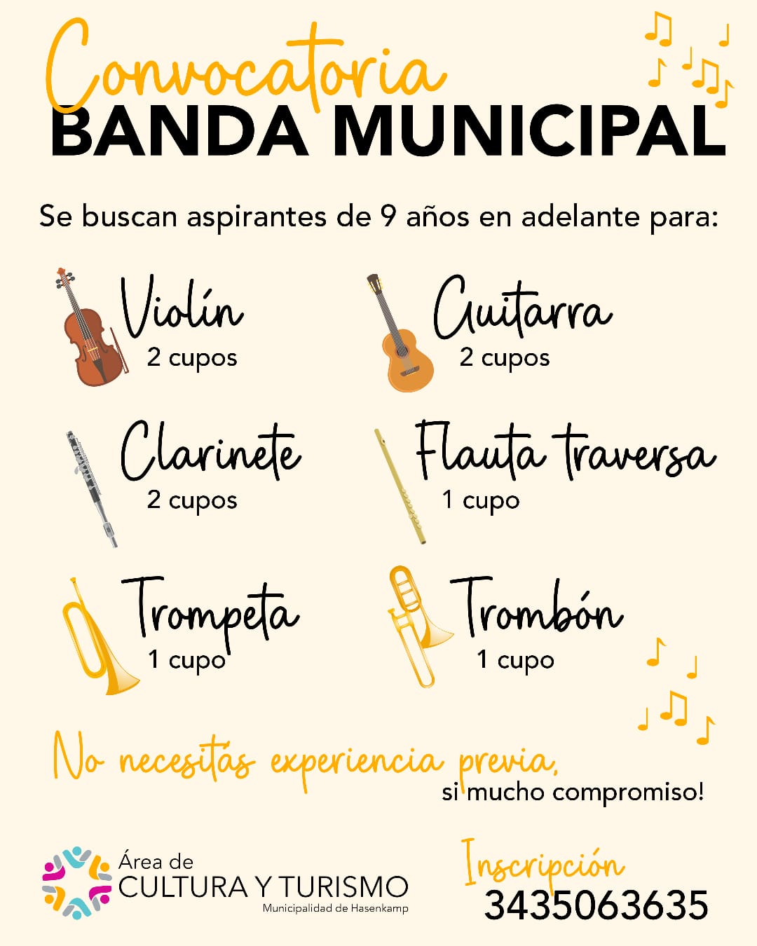 Nuestra Banda Municipal de Música sigue creciendo, por eso si te gustaría aprender música y formar parte de ella, esta convocatoria es para vos La propuesta está destinada a niñas, niños, jóvenes y adultos desde los 9 años en adelante, que deseen ser parte de este espacio artístico. En esta oportunidad, se encuentran disponibles los siguientes cupos: Violín (2 cupos) Clarinete (2 cupos) Flauta traversa (1 cupo) Guitarra (2 cupos) Trompeta (1 cupo) Trombón (1 cupo) El director de la banda, Nicolás Müller, informó que no es necesario contar con experiencia previa, aunque remarcó que es fundamental asumir el compromiso de asistir a los ensayos, estudiar en casa, participar de las presentaciones y disponer de tiempo para las actividades de la banda. Las audiencias se realizarán el 28 de abril de 16:30 a 20:00 hs, en Casa de la Cultura Inscripción: 3435 06-3635 o Casa de la Cultura Lunes a viernes de 08:00 a 13:00 hs Los cupos son limitados, por lo se recomienda realizar la inscripción con anticipación. Sumate a aprender, crecer y hacer música junto a la Banda Municipal de Música.