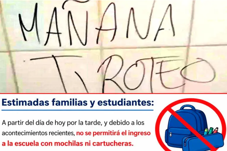 Amenazas de tiroteos escolares: una escuela de Entre Ríos ya prohibió el ingreso de mochilas Tras reiteradas amenazas de tiroteos, una escuela del departamento Concordia, adoptó medidas preventivas como prohibir mochilas, se confirmó a Elonce. Buscan identificar al autor de los mensajes. 23 de Abril de 2026 REDACCIÓN ELONCE Tras reiteradas amenazas de tiroteos, una escuela del departamento Concordia, adoptó medidas preventivas como prohibir mochilas, se confirmó a Elonce. Buscan identificar al autor de los mensajes. El hecho ocurrido semanas atrás en una escuela de San Cristóbal, Santa Fe, donde un adolescente mató a otro, generó una ola de amenazas de tiroteos a nivel nacional que tuvo amplia repercusión. A raíz de ello, se puso en debate cuándo una broma deja de serlo y se transforma en un caso, que puede llegar a tener sanciones, ya que se consideran un delito. En la mayoría de los casos, se trabajó de manera coordinada con el Ministerio de Seguridad, la Policía, el Consejo Provincial del Niño, el Adolescente y la Familia (Copnaf) y la Justicia, incluyendo la intervención del fuero de menores. Amenaza en escuela secundaria Los hechos de este tipo se repiten y este miércoles, por la mañana, tuvieron lugar escritos de amenazas en el baño femenino de una escuela del departamento Concordia, específicamente, la Escuela Secundaria N°3 Francisco Ramírez de la localidad de Los Charrúas. El periodista Ariel Mazetto, director del sitio La Región Digital, contó a Elonce, que los directivos llamaron a la policía e hicieron una serie de pasos que están articulados. No pasó nada al respecto, pero se busca ubicar quién puede ser el autor, explicó. Los efectivos policiales tomaron muestras de huellas dactilares en el espejo, se llevaron algunos elementos que pueden contener huellas, como una forma de poder acercarse a identificar quién sería el autor del escrito, sostuvo el periodista y agregó a Elonce que después, se continuará con los pasos legales que la justicia disponga para este tipo de hechos, resaltó. Medida de emergencia Ver más Archivo noticias Libros sobre fauna silvestre Libros sobre salud mental Sin embargo, desplegar el protocolo ante este tipo de hechos, muchas veces no alcanza para tranquilizar a la comunidad educativa y algunas escuelas comenzaron a tomar llamativas medidas de emergencia, para descartar cualquier tipo de presunta amenaza y minimizar el riesgo en las instituciones. Una de ellas, es el caso de la Escuela Secundaria N° 3 Francisco Ramírez de la localidad de Los Charrúas, que prohibió el ingreso mochilas a la institución, supo Elonce. La Escuela Secundaria de Los Charrúas, en el departamento Concordia, emitió un comunicado para dar a conocer las nuevas medidas que se implementarán como prevención ante las reiteradas amenazas de tiroteos escolares que se dieron en diferentes puntos del país y que en Entre Ríos, totalizaron más de 180 denuncias por diferentes amenazas en instituciones educativas del territorio provincial. Llevar una bolsa transparente Al respecto, el comunicado solicita la comprensión y colaboración de la comunidad educativa. El pedido menciona que a partir de este jueves y debido a los acontecimientos recientes, no se permitirá el ingreso a la escuela con mochilas ni cartucheras. En el escrito difundido a través de las redes sociales oficiales de la Escuela Secundaria N°3, solicitan que los estudiantes concurran a clases con bolsa transparente y llevar únicamente los materiales correspondientes a las materias del día, señala el breve texto firmado por el Equipo Directivo y Pedagógico. En las últimas horas, se dio a conocer que no existe una disposición general para este tipo de medias, pero que estas normativas, son adoptadas en su totalidad por las autoridades de cada establecimiento. Tu comentario ha sido enviado, el mismo se encuentra pendiente de aprobación...[X] ver más El comentario se encuentra deshabilitado Denunciar comentario Spam o contenido comercial no deseadoIncitación al odio o a la violencia, o violencia gráficaAcoso o bullyingInformación errónea CancelarDenunciar Tu comentario ha sido enviado, el mismo se encuentra pendiente de aprobación...[X] Ver más comentarios IMPORTANTE: Los comentarios publicados son exclusiva responsabilidad de sus autores Elonce.com se reserva el derecho de eliminar aquellos comentarios injuriantes o discriminadores.