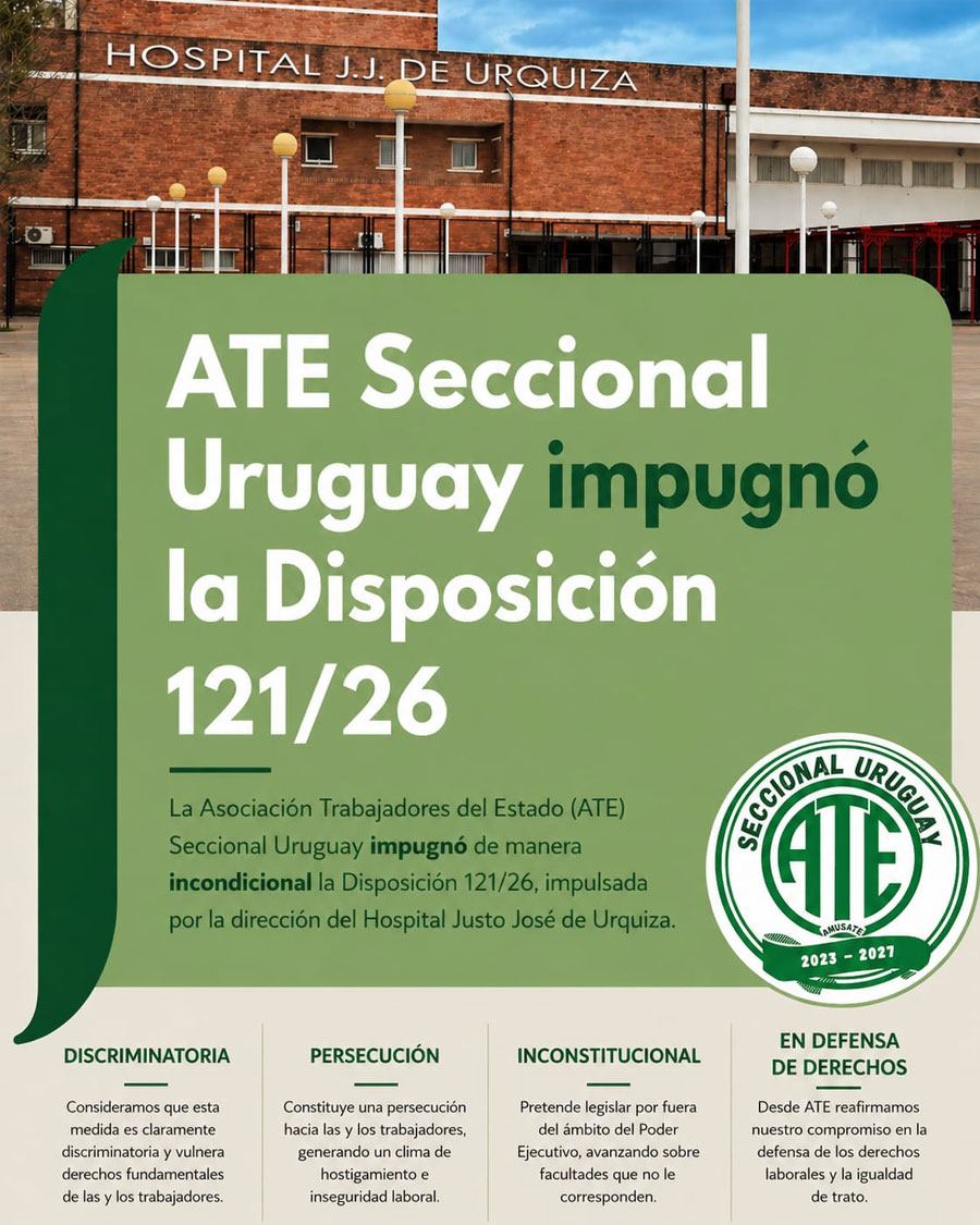 ATE Seccional Uruguay impugnó de manera incondicional la Disposición 121/26, impulsada por la dirección del Hospital Justo José de Urquiza. Consideramos que esta medida es claramente discriminatoria, constituye una persecución hacia los/as trabajadores y vulnera derechos fundamentales conquistados históricamente. Además de la presentación realizada ante el propio director del hospital impugnando la medida, se solicitó mediación ante la Secretaría de Trabajo. En este mismo sentido, se requirió la intervención del Ministerio de Salud, a fin de que tome conocimiento de la situación y actúe en consecuencia frente a esta decisión arbitraria. Advertimos con preocupación que esta disposición intenta avanzar sobre facultades que no le corresponden, pretendiendo legislar por fuera del ámbito del Poder Ejecutivo, lo que resulta inadmisible. No vamos a permitir retrocesos ni medidas arbitrarias que atenten contra los/as trabajadores. Oscar Alberto Muntes