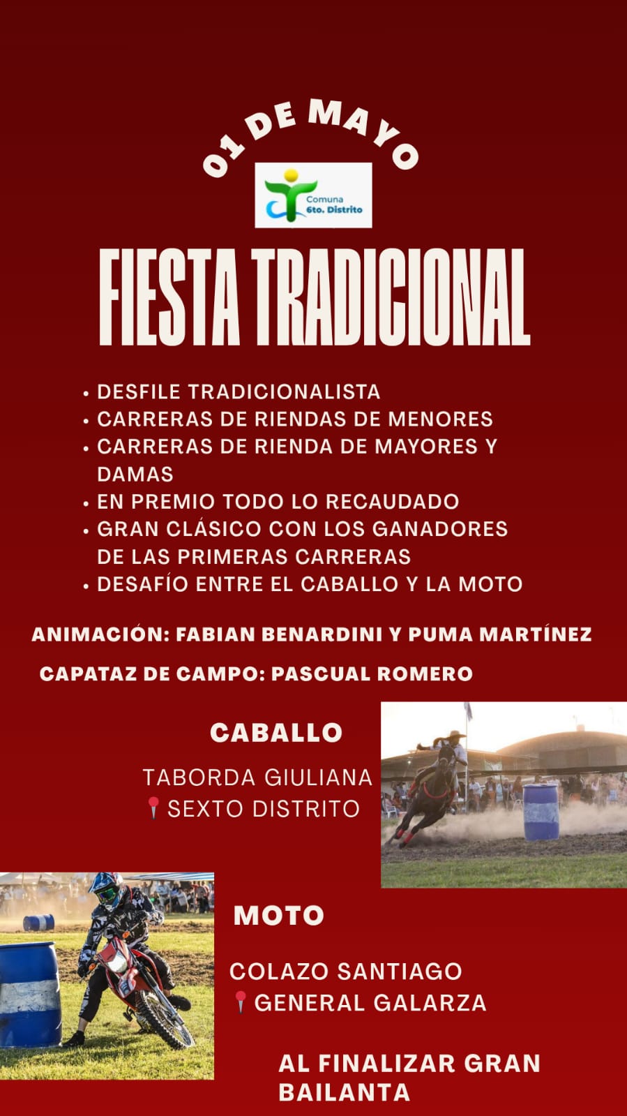 Sexto Distrito celebra el 1° de Mayo con una gran fiesta tradicional La Comuna de Sexto Distrito organiza una Fiesta Tradicional para el próximo 1° de mayo, con una nutrida agenda de actividades criollas que apuntan a convocar a vecinos y visitantes de toda la región. De acuerdo al flyer difundido oficialmente, la jornada incluirá un desfile tradicionalista y diversas competencias ecuestres, entre ellas carreras de riendas tanto para menores como para mayores y damas. Además, se anunció que todo lo recaudado será destinado a premios, lo que le otorga un atractivo adicional a la propuesta. Uno de los momentos destacados será el gran clásico, en el que participarán los ganadores de las primeras competencias, así como también un desafío especial entre caballo y moto, una de las atracciones más esperadas por el público. La animación estará a cargo de Fabián Benardini y Puma Martínez, mientras que Pascual Romero se desempeñará como capataz de campo, garantizando el desarrollo de las actividades tradicionales. El evento contará con la participación de jinetes y competidores de la zona, entre ellos Giuliana Taborda, representante local en la categoría caballo, y Santiago Colazo, oriundo de General Galarza, quien competirá en moto. Como cierre, se anunció una gran bailanta, completando una propuesta que combina tradición, deporte y encuentro comunitario en una fecha emblemática para los trabajadores.