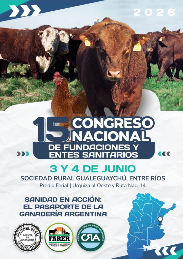 Con una agenda centrada en los principales desafíos sanitarios de la producción animal, Gualeguaychú será sede de un nuevo encuentro nacional que reunirá a referentes de todo el país. Se trata del 15° Congreso Nacional de Fundaciones y Entes Sanitarios, una cita que pondrá el foco en la sanidad como eje estratégico para el desarrollo ganadero argentino. Bajo el lema Sanidad en acción: el pasaporte de la ganadería argentina, se desarrollará los días 3 y 4 de junio de 2026 en el Auditorio de la Sociedad Rural Gualeguaychú, ubicado en Urquiza al oeste y ruta nacional 14, en la provincia de Entre Ríos. La organización estará a cargo de Confederaciones Rurales Argentinas (CRA), la Federación de Asociaciones Rurales de Entre Ríos (FARER) y la Sociedad Rural Gualeguaychú (SRG). El Congreso convocará a dirigentes rurales, técnicos, profesionales, funcionarios de distintos niveles del Estado, representantes del ámbito académico, empresas y organismos vinculados al sistema sanitario. La propuesta apunta a generar un espacio de intercambio y actualización sobre las problemáticas que impactan en la sanidad animal y, en consecuencia, en la competitividad del sector. Durante las jornadas se desarrollarán exposiciones técnicas, mesas de debate, análisis de casos y presentaciones de experiencias territoriales. Entre los ejes previstos se destacan enfermedades como aftosa, la brucelosis y la garrapata, los procesos de certificación vinculados a la sostenibilidad, las exigencias de los mercados internacionales, la incorporación de inteligencia artificial en la gestión sanitaria, los protocolos vigentes y el rol de las nuevas generaciones en el sistema productivo. En este marco, y considerando el peso estratégico de Entre Ríos como una de las principales provincias avícolas del país, el programa incluirá un panel específico dedicado a la sanidad avícola. Este espacio abordará los desafíos y oportunidades del sector, con foco en la prevención, el control sanitario y la competitividad de una actividad clave para la economía regional. Además, el encuentro contará con la participación de autoridades nacionales, provinciales y locales, reforzando su carácter institucional y federal. En ese sentido, el Congreso busca consolidarse como un ámbito de construcción colectiva donde se delineen estrategias que fortalezcan el modelo sanitario argentino, entendiendo a la sanidad animal como un pilar clave para el crecimiento y la proyección de la ganadería. La actividad requerirá inscripción previa. Precisamente para participar hay que ingresar al siguiente link y completar el formulario: https://forms.gle/pkdBFU5dvEKcuaez9