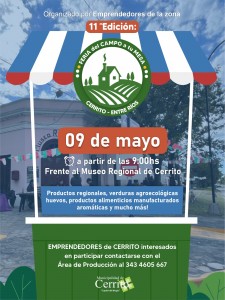 Leido 4 veces El próximo 9 de mayo, se realizará una nueva edición de la Feria del Campo a tu Mesa, organizada por emprendedores de la zona. Desde las 9:00, frente al Museo Regional de Cerrito, podrán encontrar productos regionales, verduras agroecológicas, huevos, alimentos elaborados, aromáticas y mucho más. Los emprendedores de Cerrito interesados en participar pueden comunicarse con el Área de Producción al 343 4605 667. ¡Te esperamos para disfrutar y apoyar lo nuestro! Fuente: Cerrito Ciudad